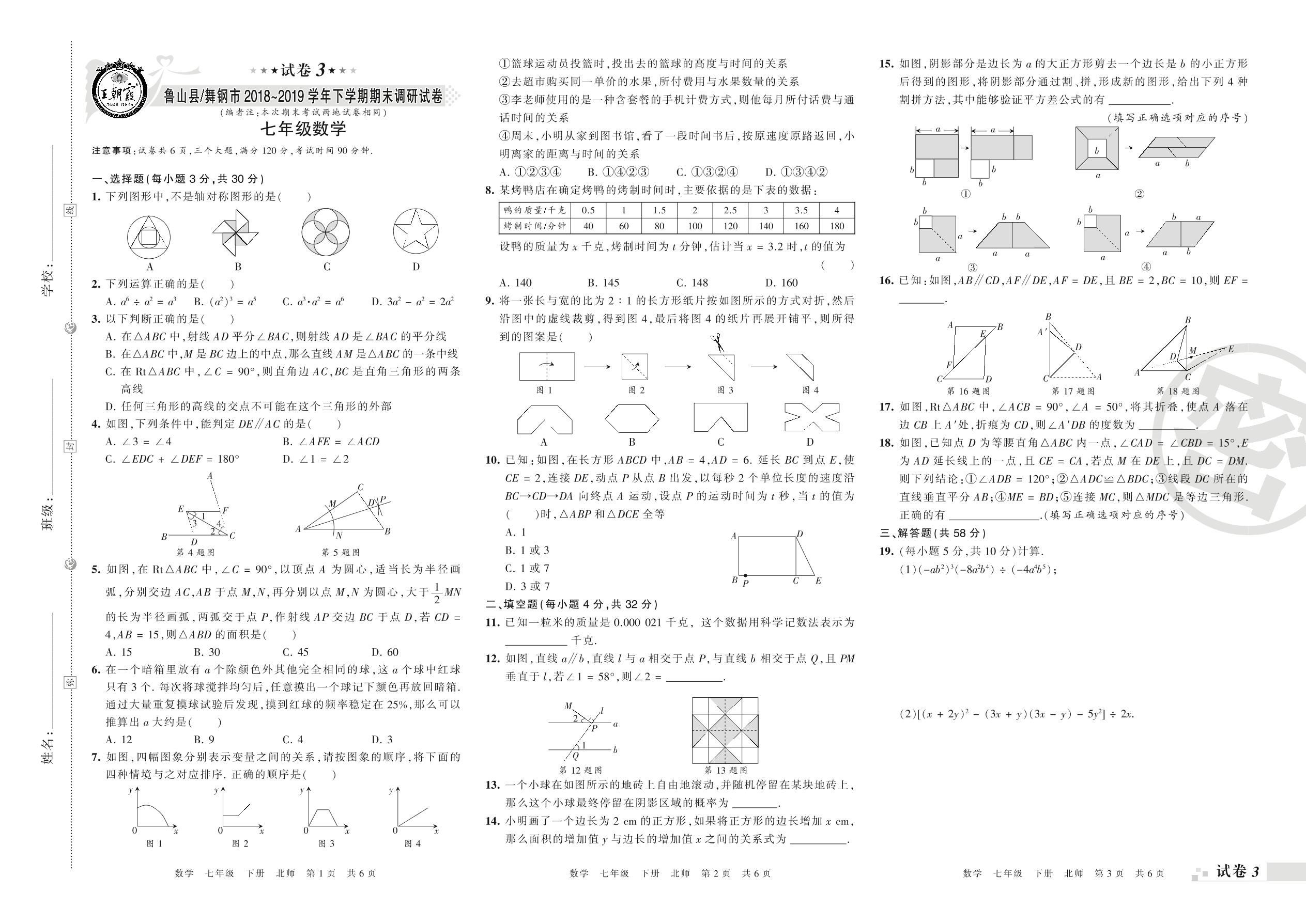 2018-2019学年第二学期鲁山县、舞钢市七年级数学试卷(北师版)【3】