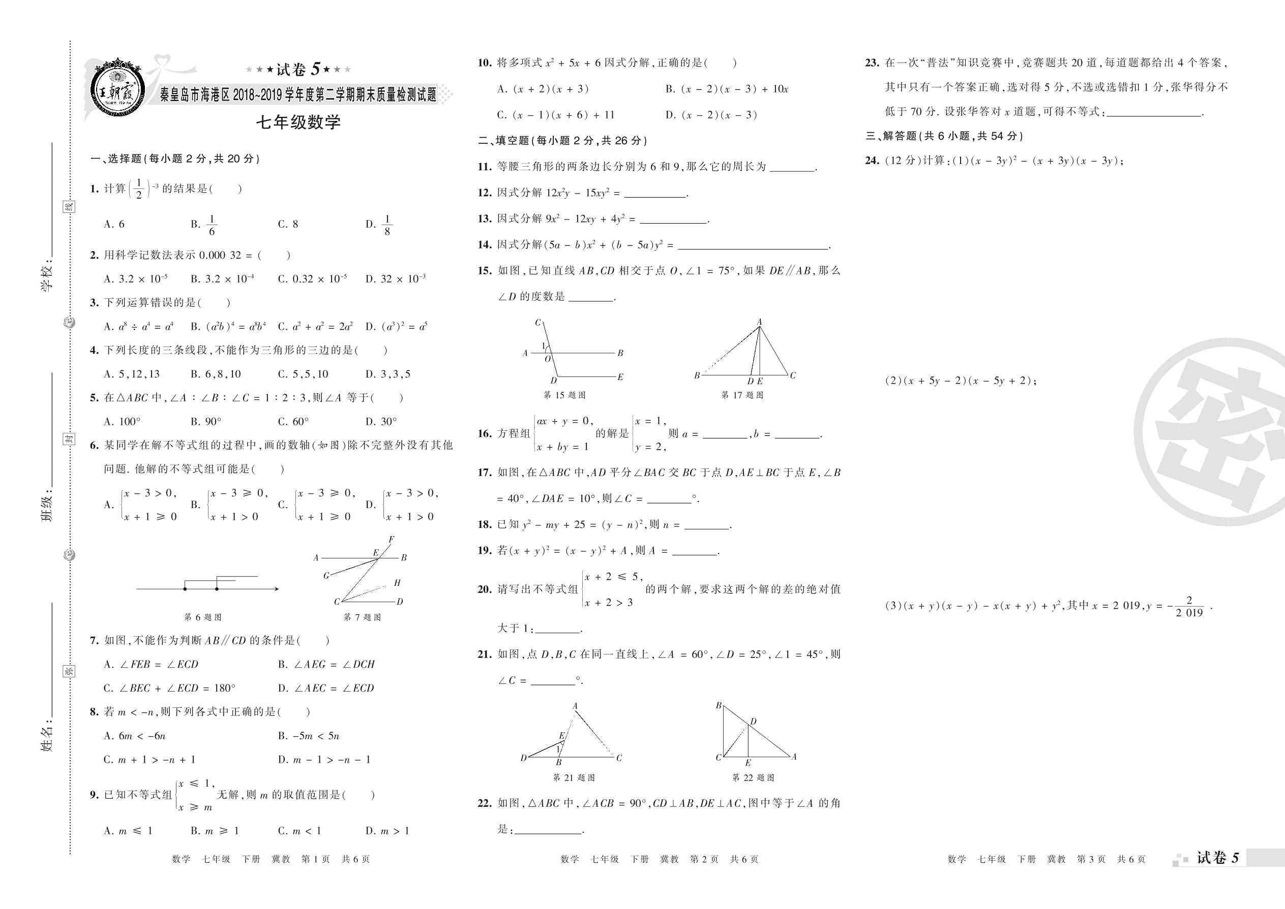 2018-2019学年第二学期秦皇岛市海港区七年级数学试卷(冀教版)【5】