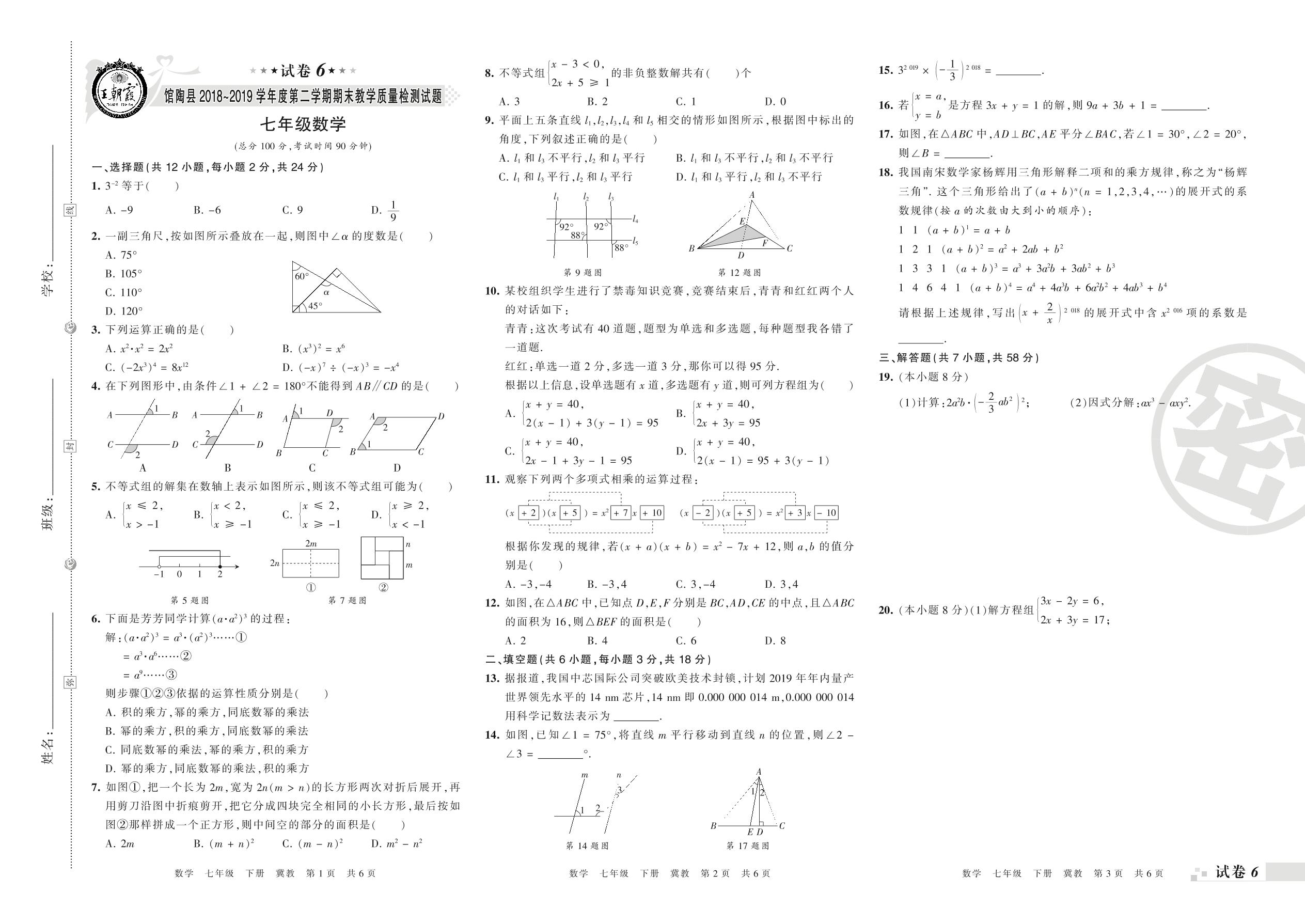 2018-2019学年第二学期邯郸市馆陶县七年级数学试卷(冀教版)【6】