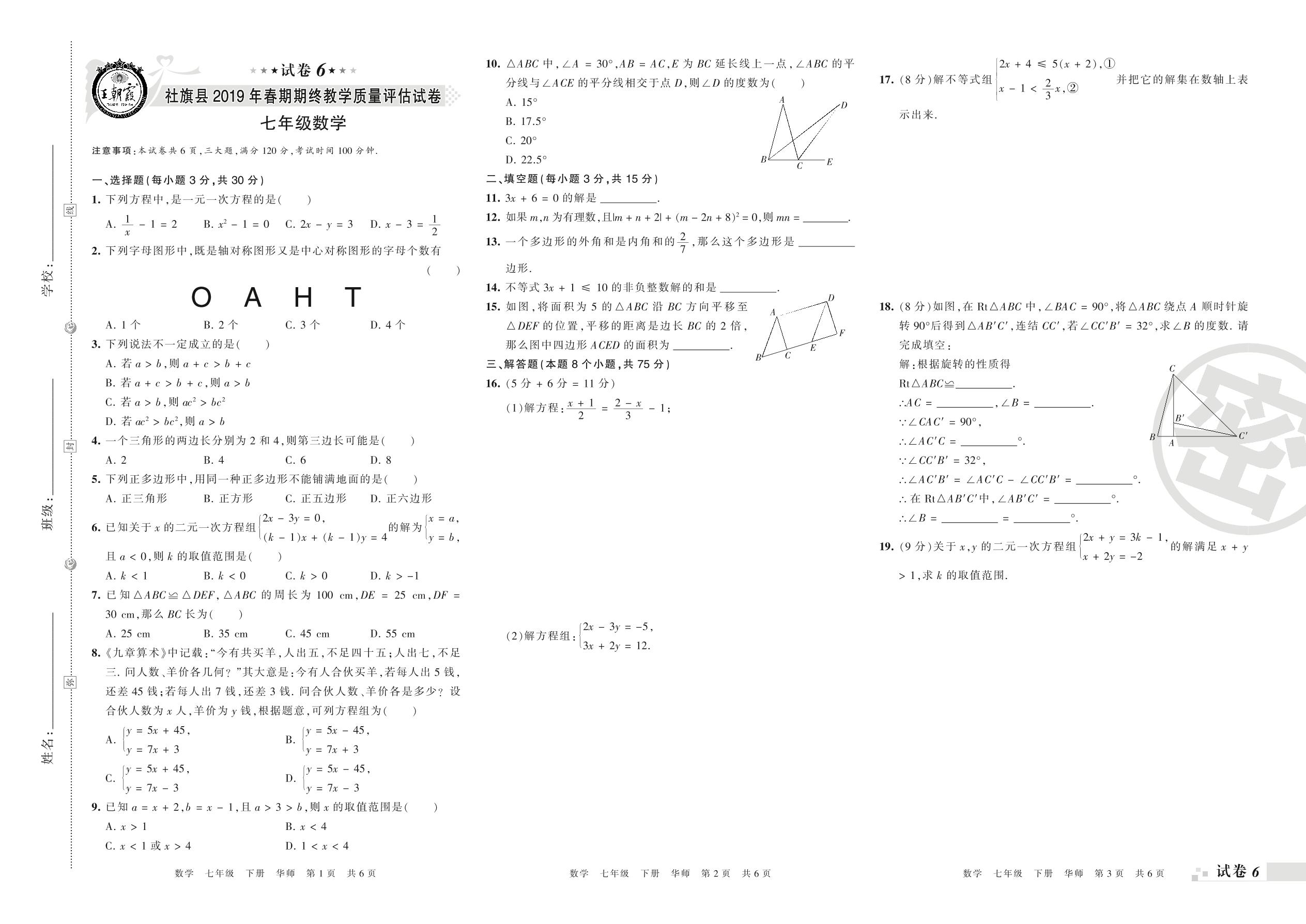 2018-2019学年第二学期南阳市社旗县七年级数学试卷(华师版)【6】