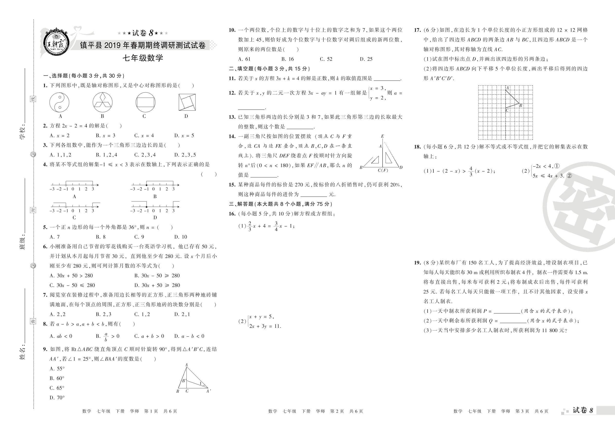 2018-2019学年第二学期南阳市镇平县七年级数学试卷(华师版)【8】