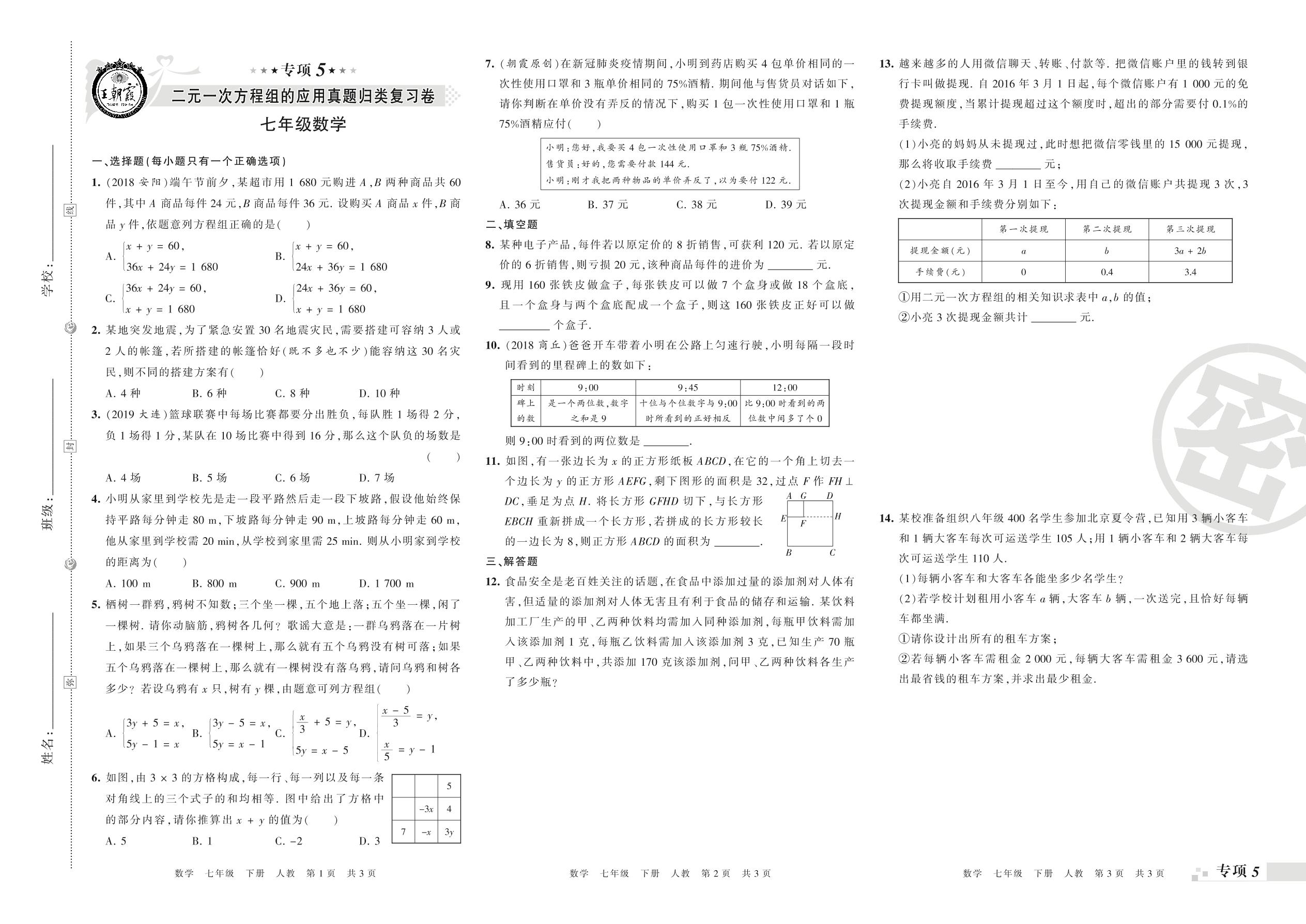 王朝霞期末专项卷——二元一次方程组的应用、不等式与不等式组的认识与解法真题归类复习卷七年级下册数学(人教版)_R210805155430【0】