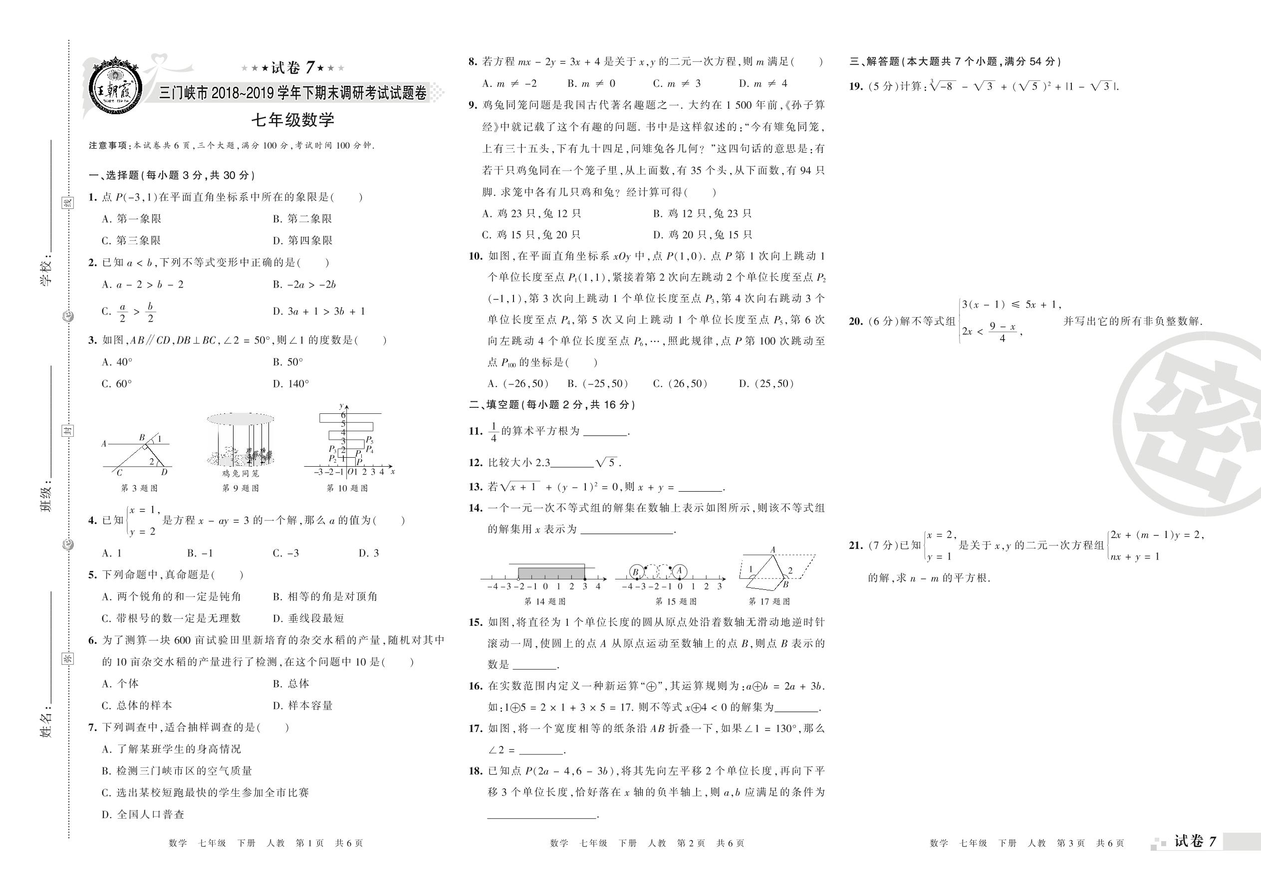 2018-2019学年第二学期三门峡市七年级数学试卷(人教版)【7】