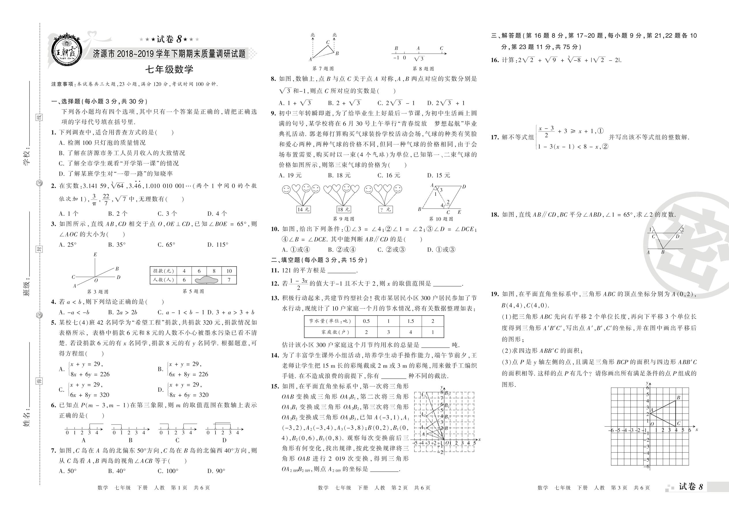 2018-2019学年第二学期济源市七年级数学试卷(人教版)【8】