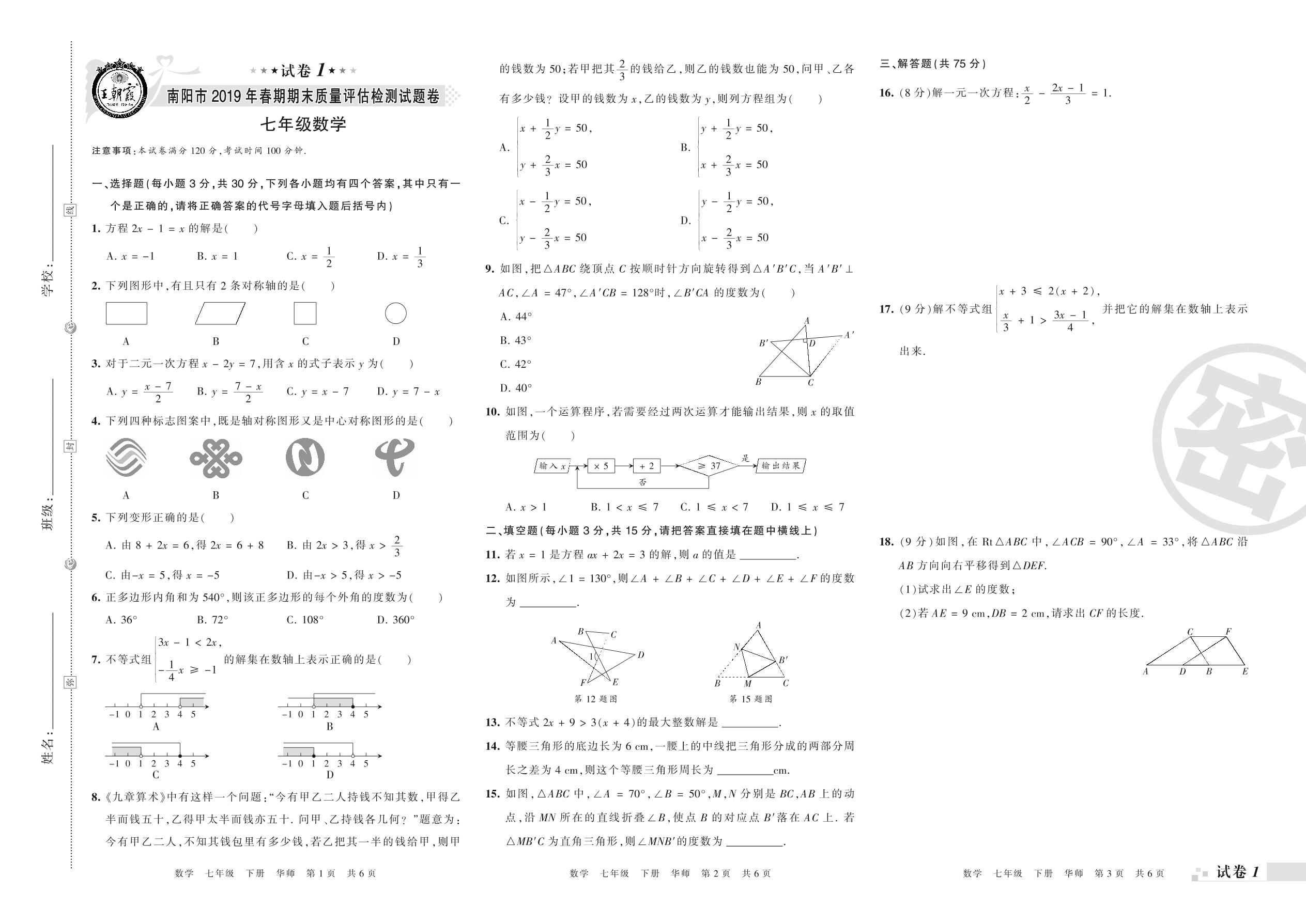 2018-2019学年第二学期南阳市七年级数学试卷(华师版)_R210805155554【1】