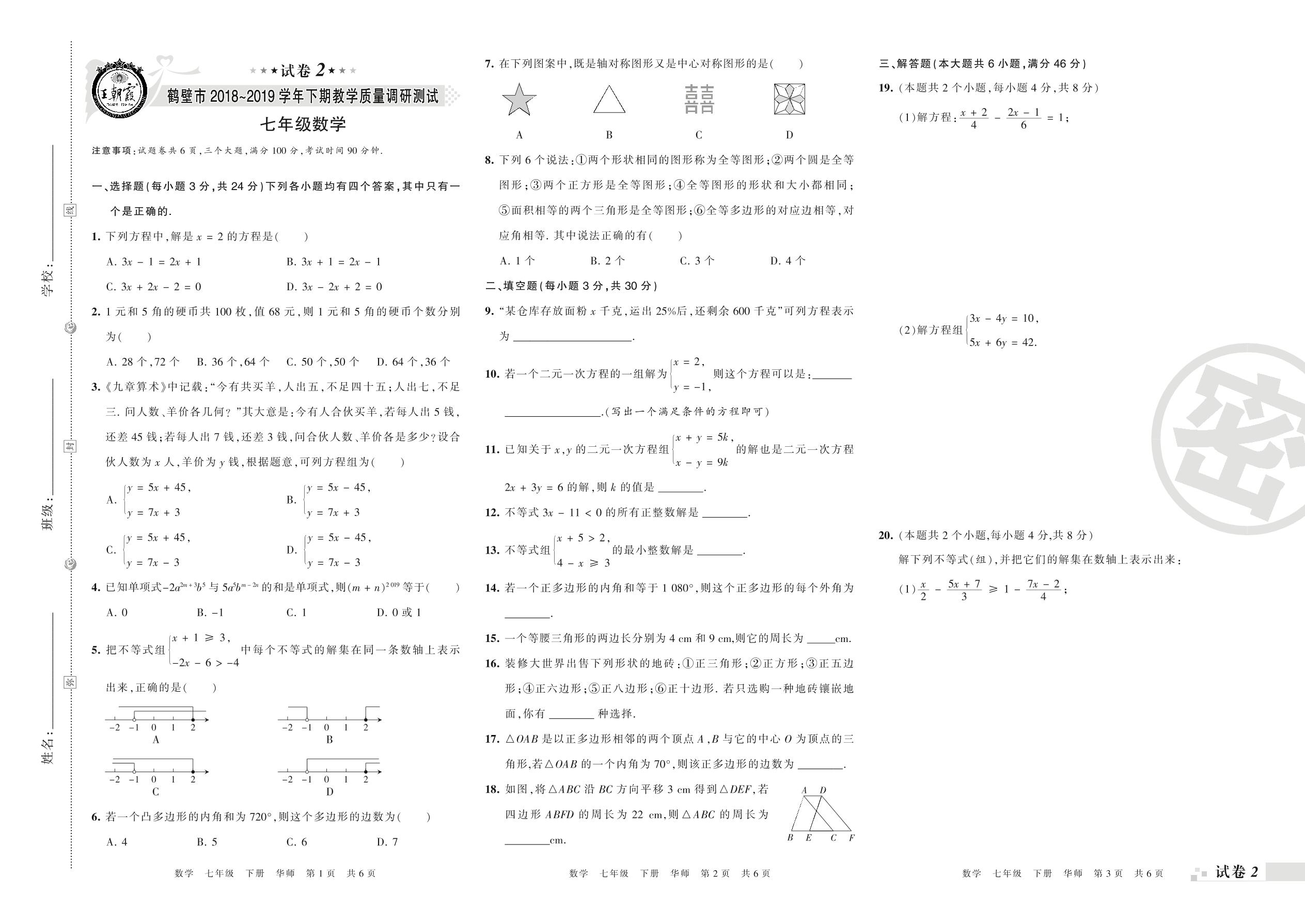 2018-2019学年第二学期鹤壁市七年级数学试卷(华师版)【2】
