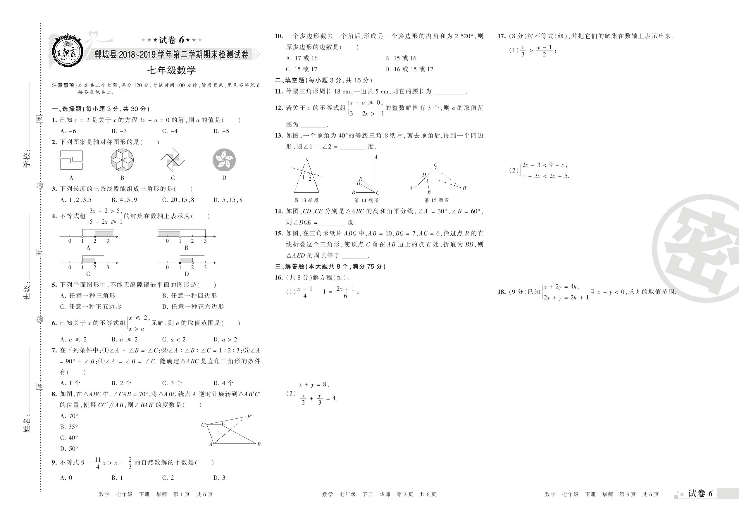 2018-2019学年第二学期周口市郸城县七年级数学试卷(华师版)【6】