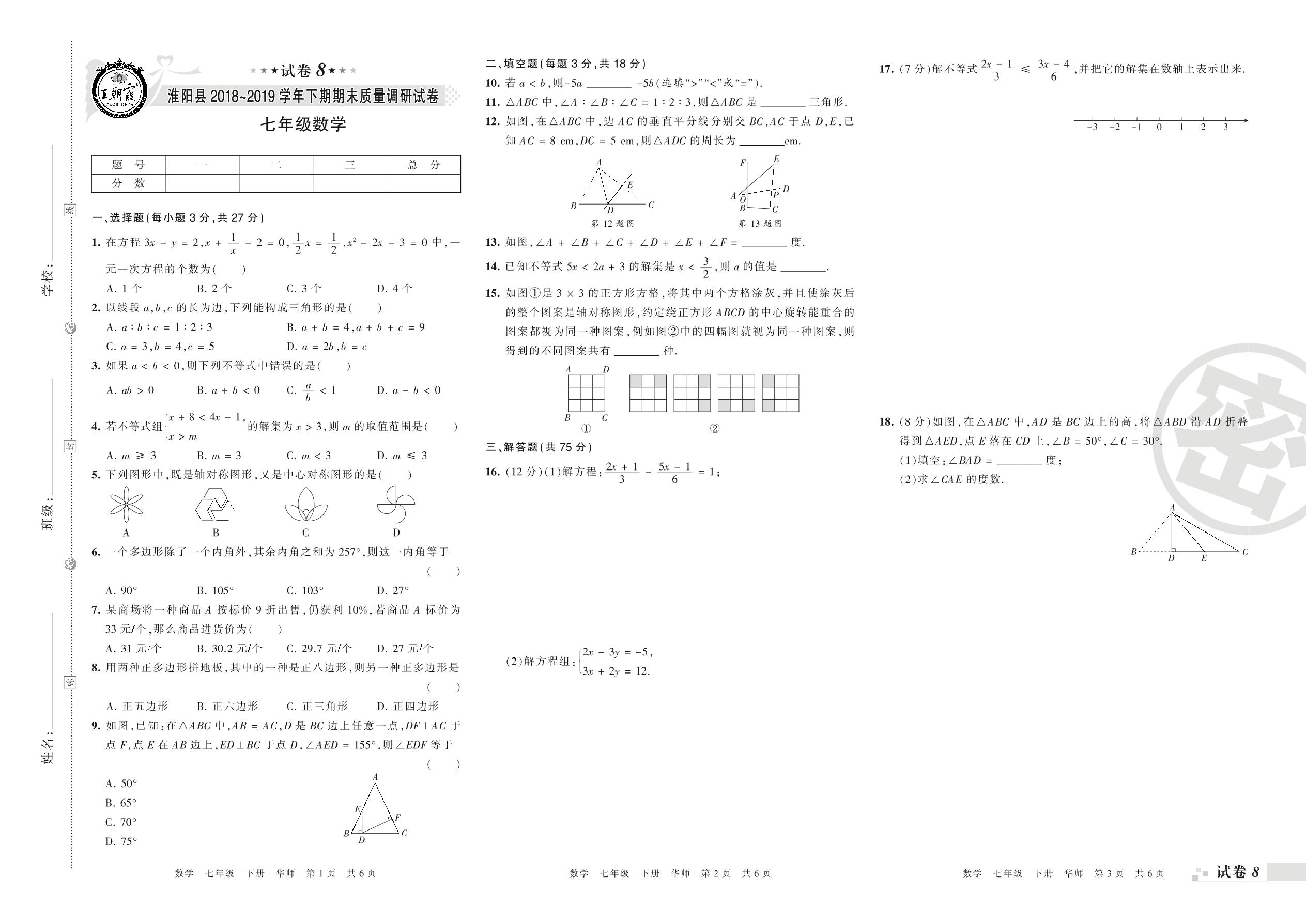 2018-2019学年第二学期周口市淮阳县七年级数学试卷(华师版)【8】