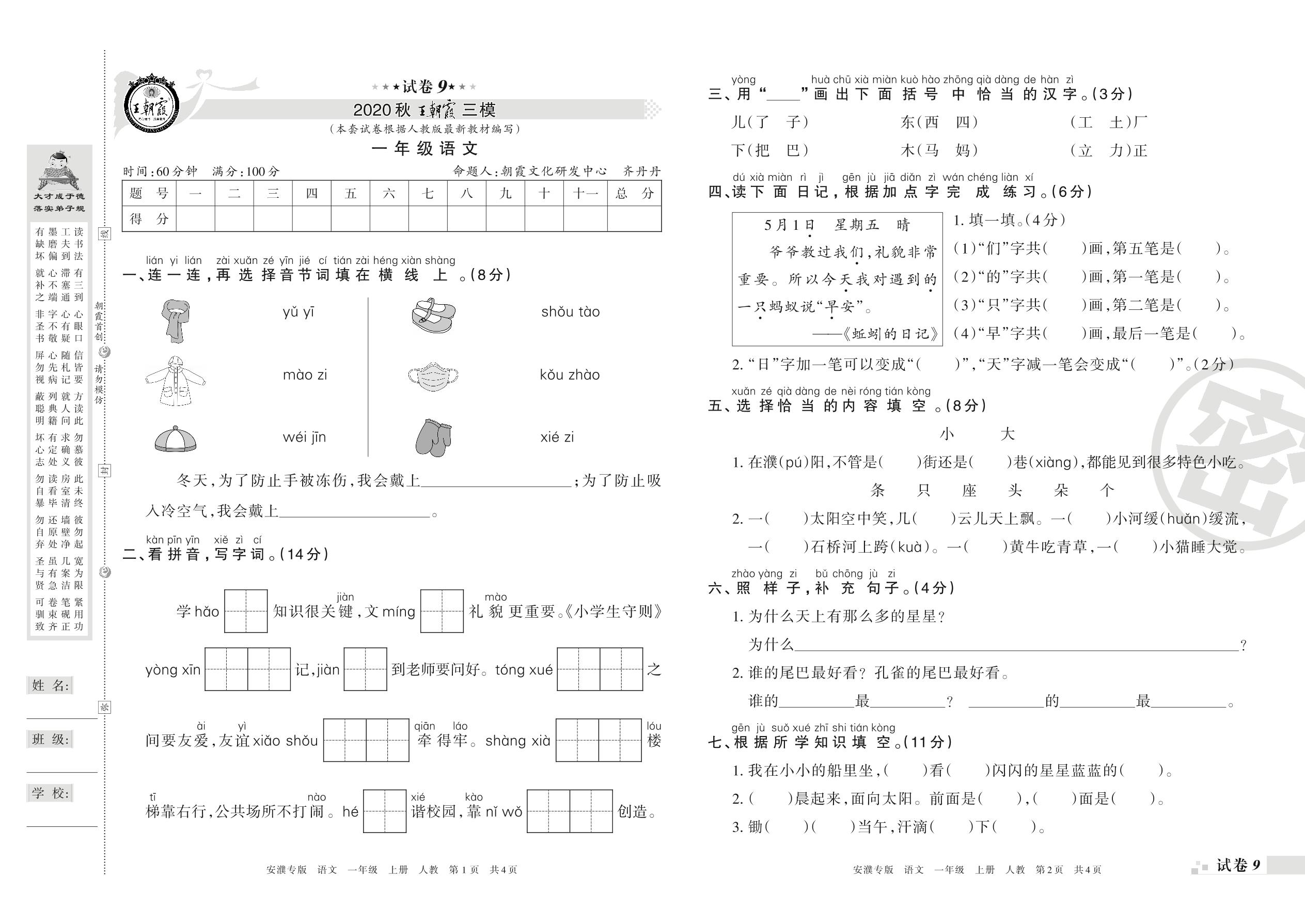 王朝霞期末模拟卷一年级上册语文(人教版)_R210731174232【9】