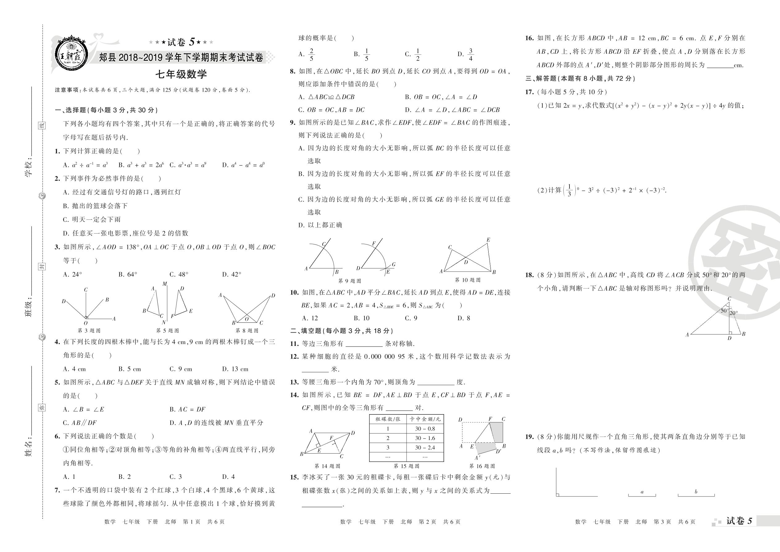 2018-2019学年第二学期平顶山市郏县七年级数学试卷(北师版)【5】