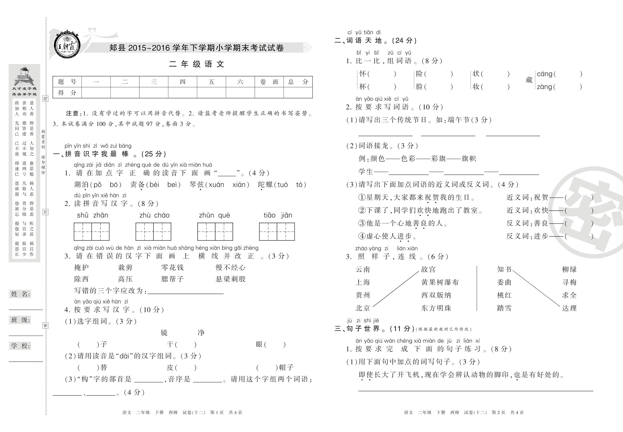 2015-2016学年第二学期平顶山市郏县二年级语文试卷(西师版)【12】
