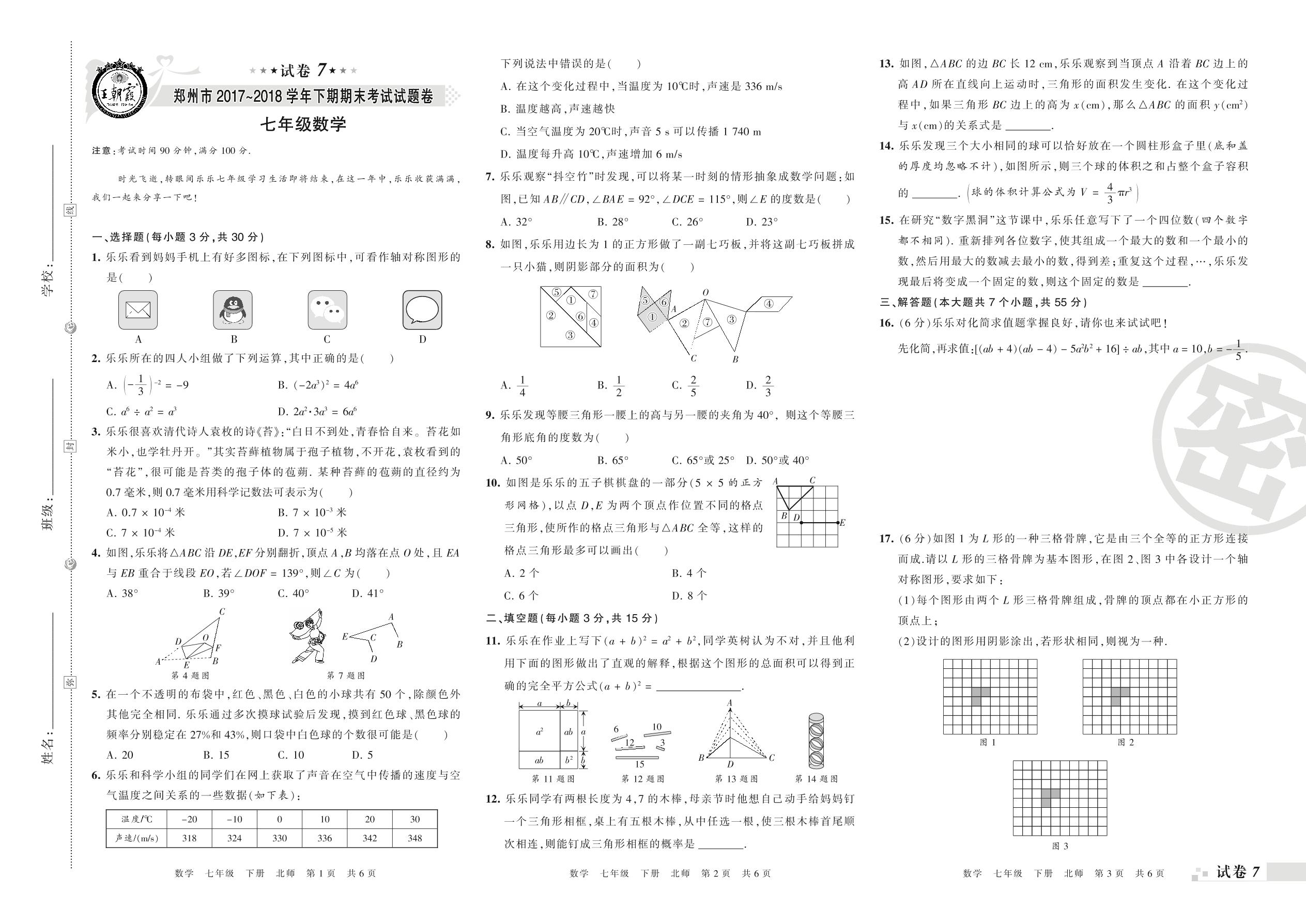 2017-2018学年第二学期郑州市七年级数学试卷(北师版)【7】