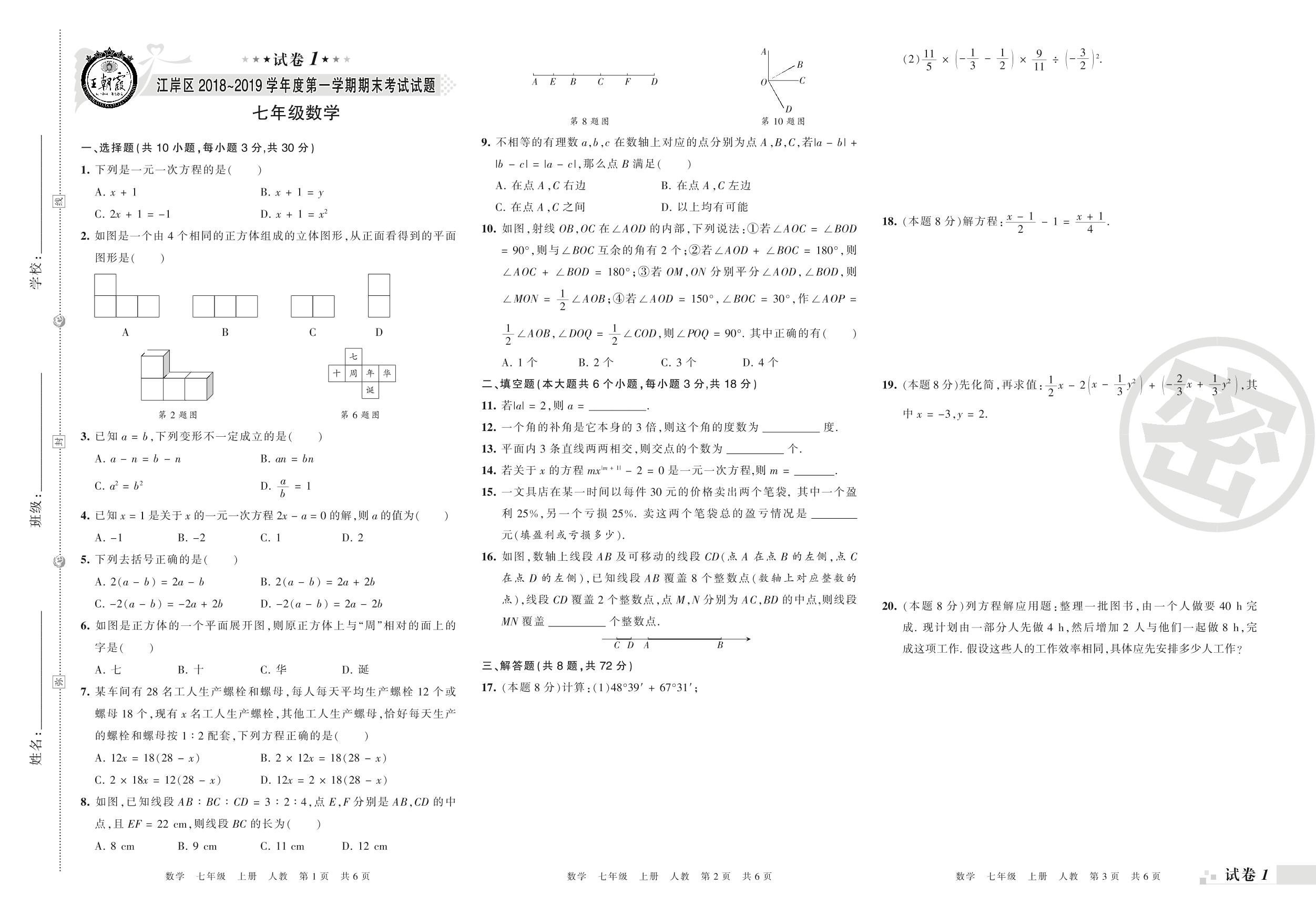 2018-2019学年第一学期武汉市江岸区七年级数学试卷(人教版)【1】