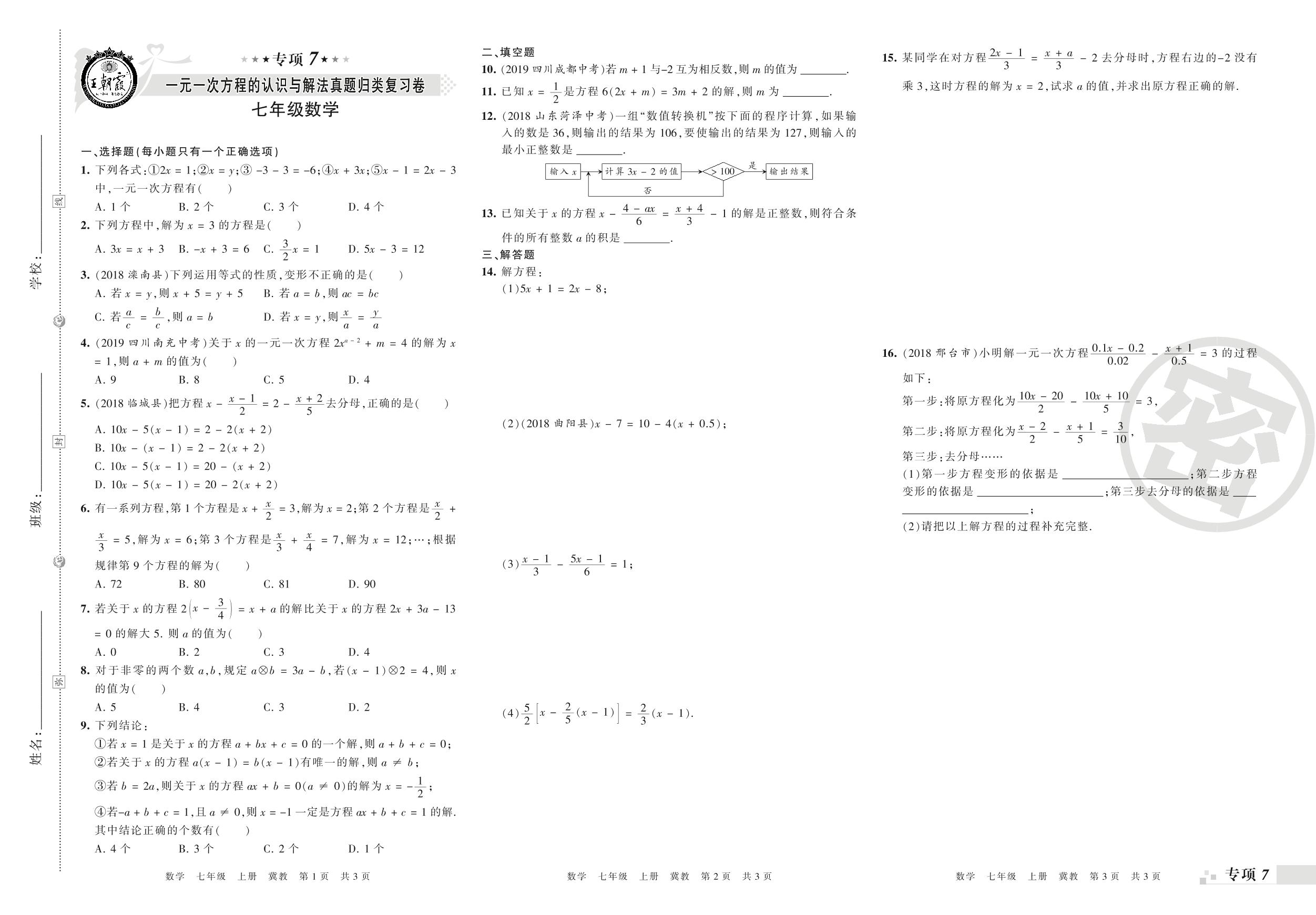 王朝霞期末专项卷——一元一次方程的认识与解法、一元一次方程的应用真题归类复习七年级上册数学(冀教版)_R210805160009【0】