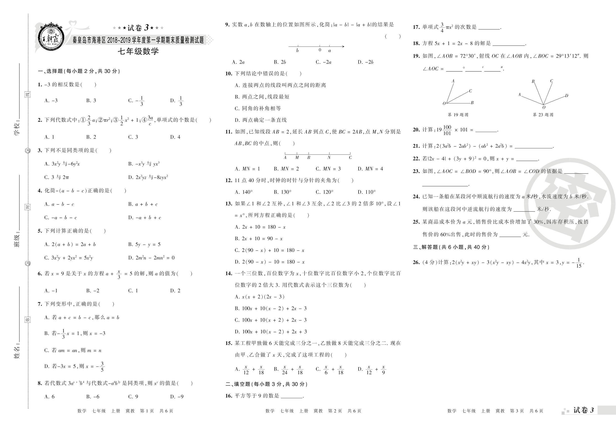 2018-2019学年第一学期秦皇岛市海港区七年级数学试卷(冀教版)【3】