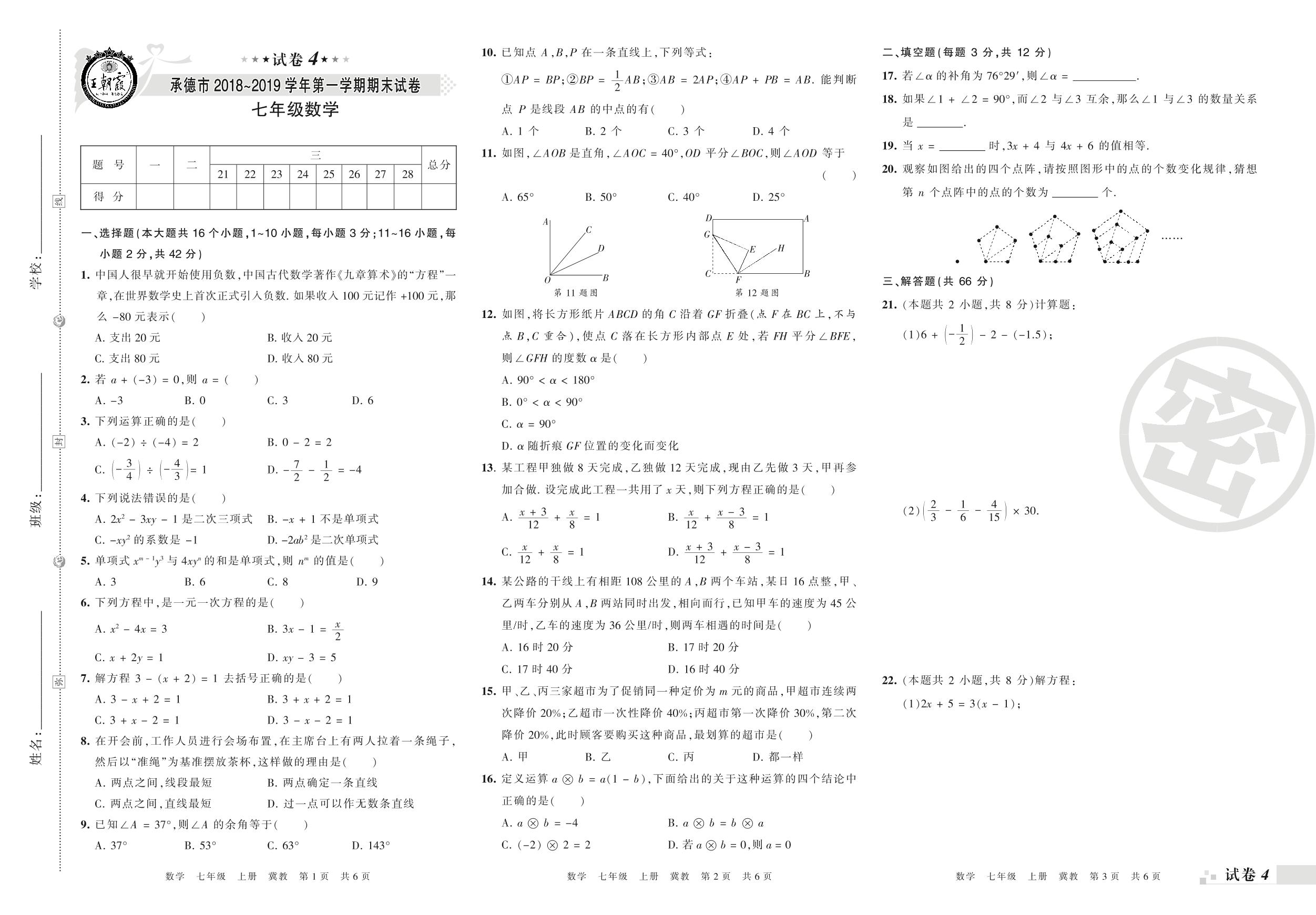 2018-2019学年第一学期承德市七年级数学试卷(冀教版)【4】