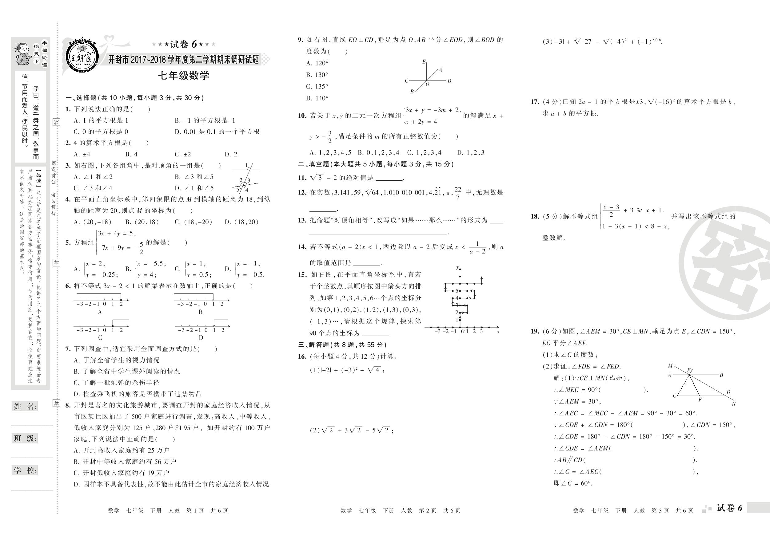 2017-2018学年第二学期开封市七年级数学试卷(人教版)【6】