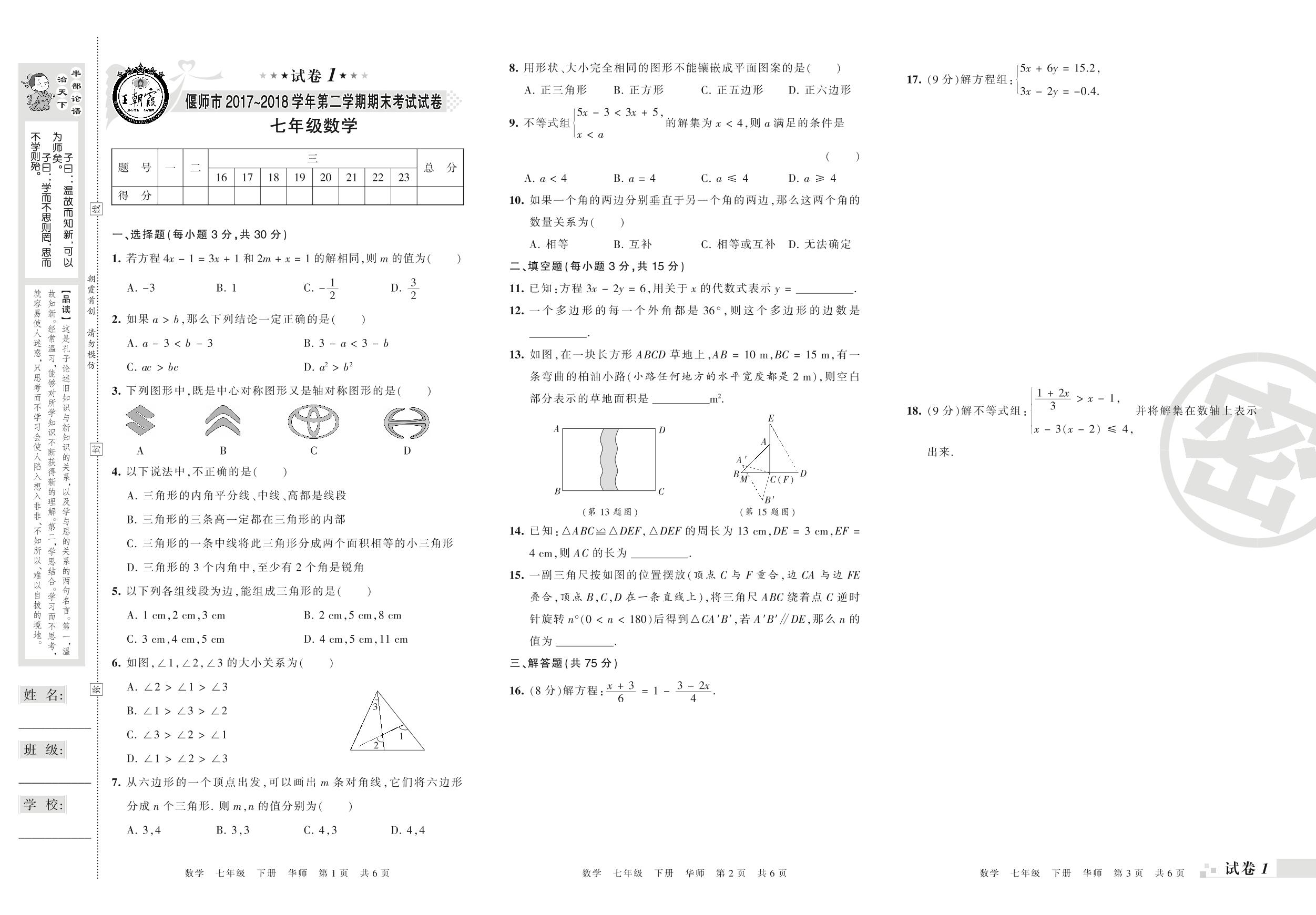 2017-2018学年第二学期偃师市七年级数学试卷(华师版)【1】