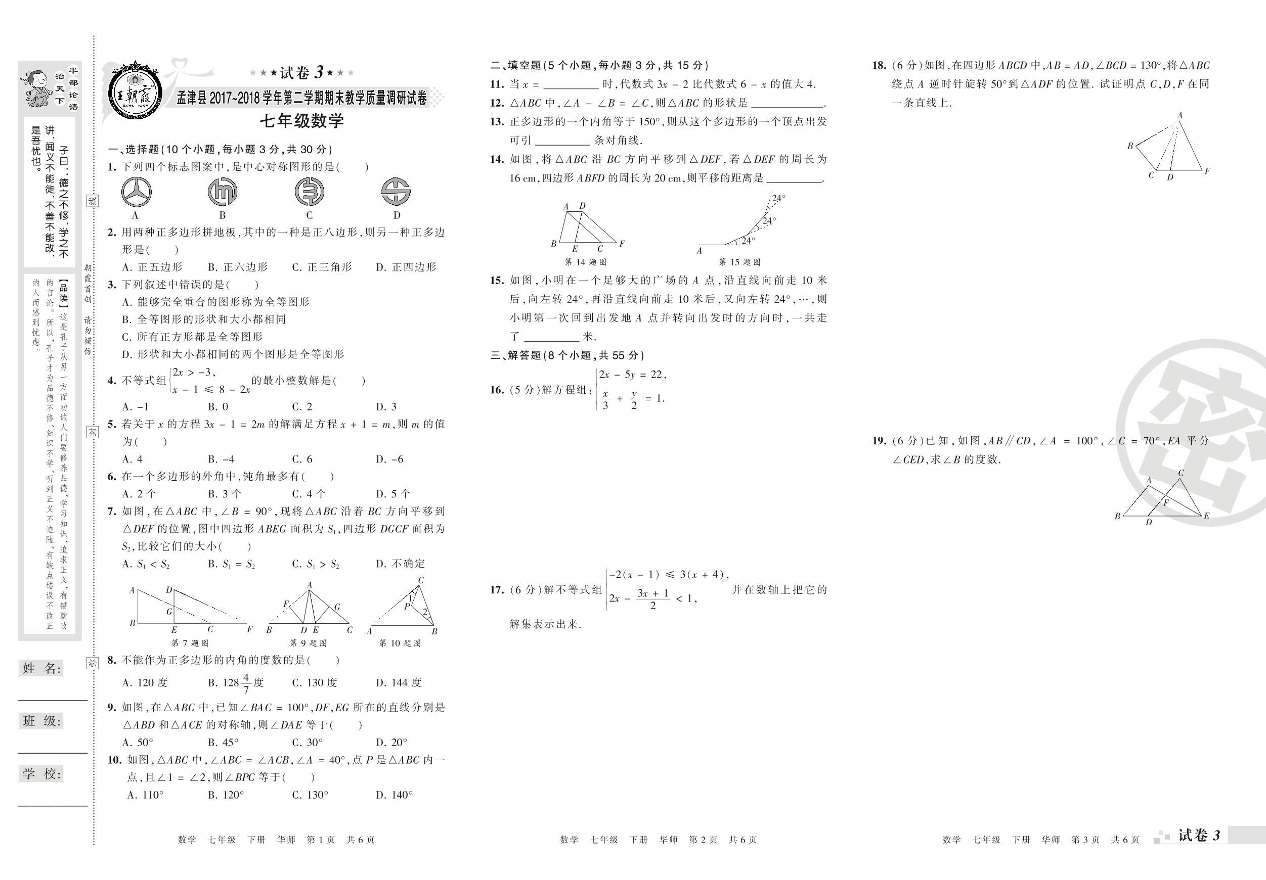 2017-2018学年第二学期洛阳市孟津县七年级数学试卷(华师版)【3】