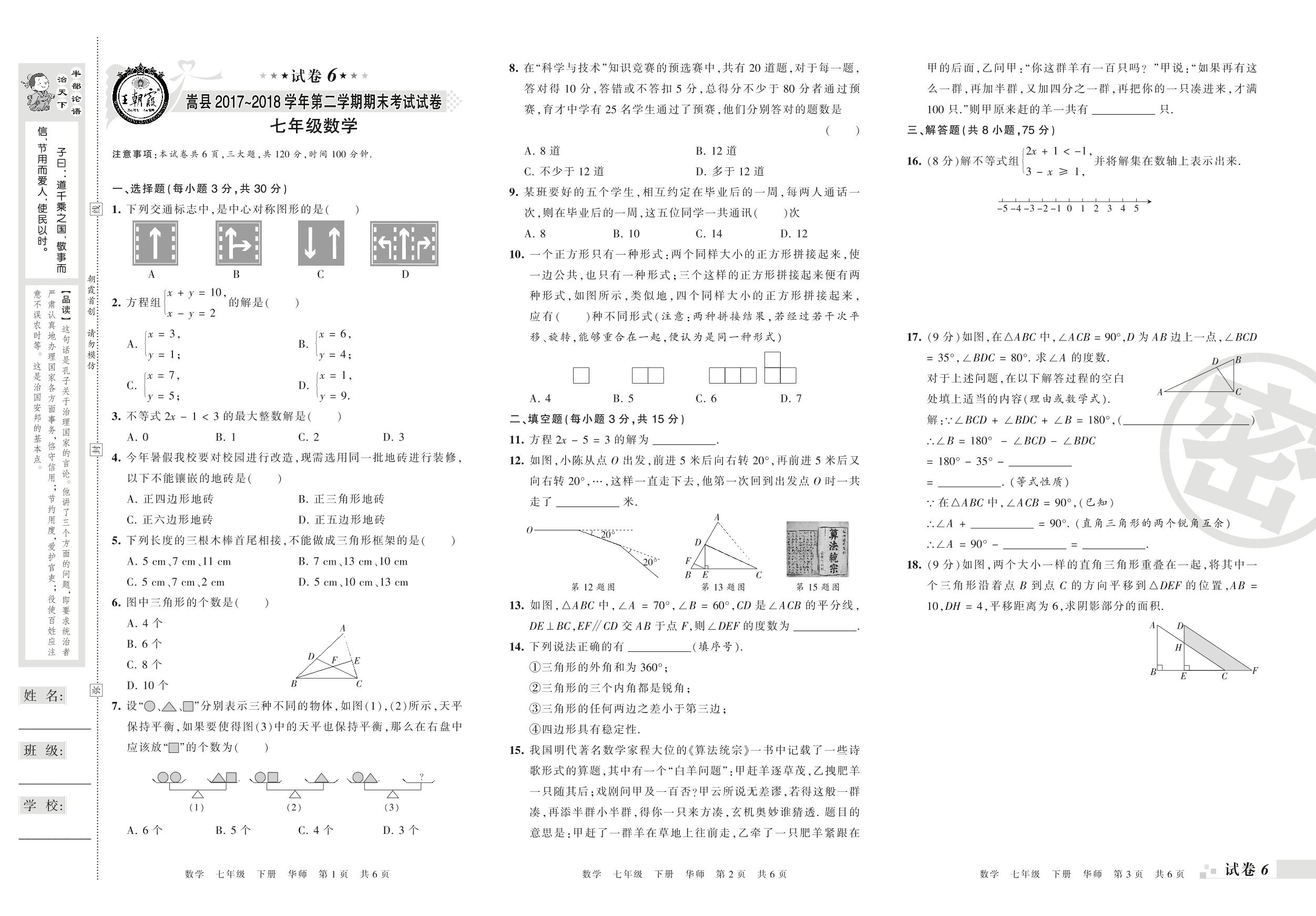 2017-2018学年第二学期洛阳市嵩县七年级数学试卷(华师版)【6】