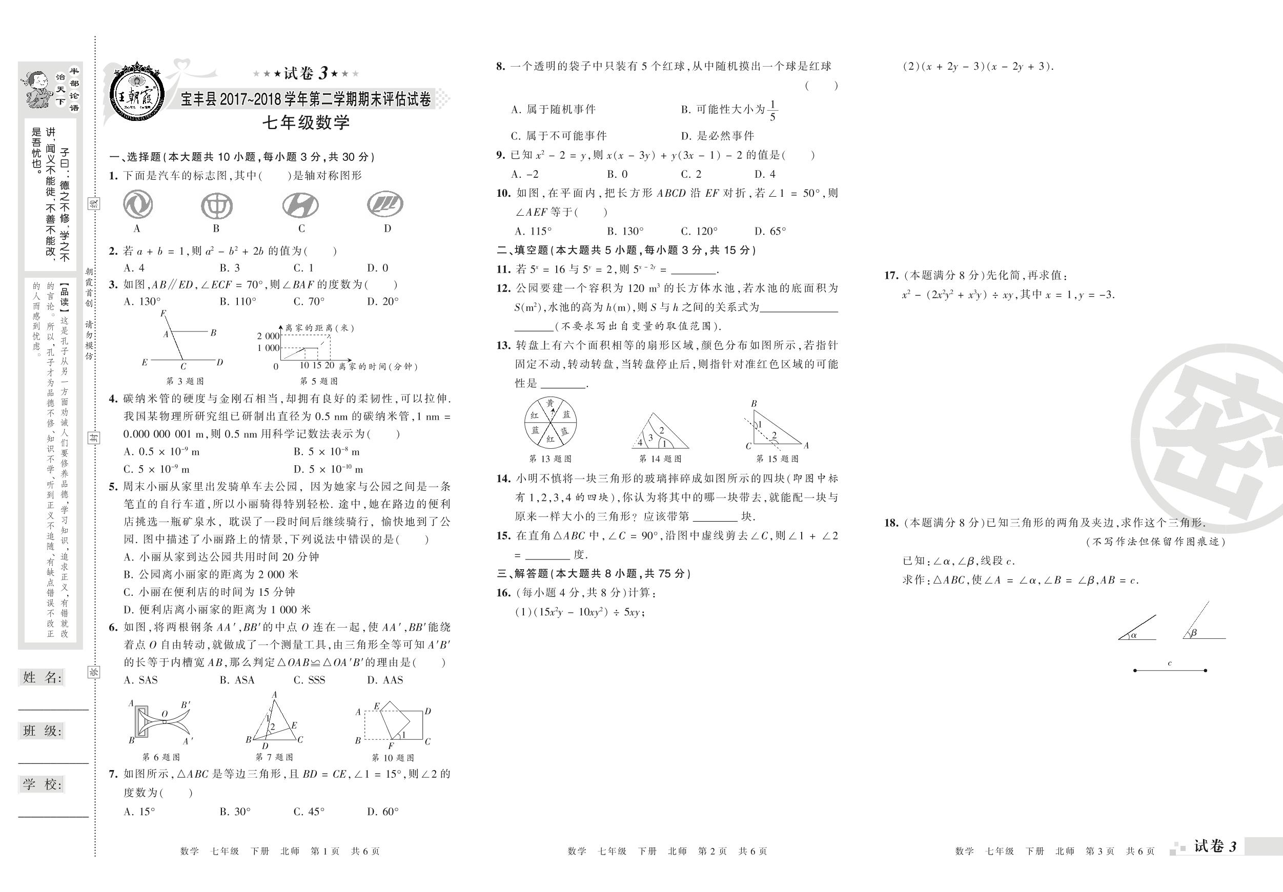 2017-2018学年第二学期平顶山市宝丰县七年级数学试卷(北师版)【3】
