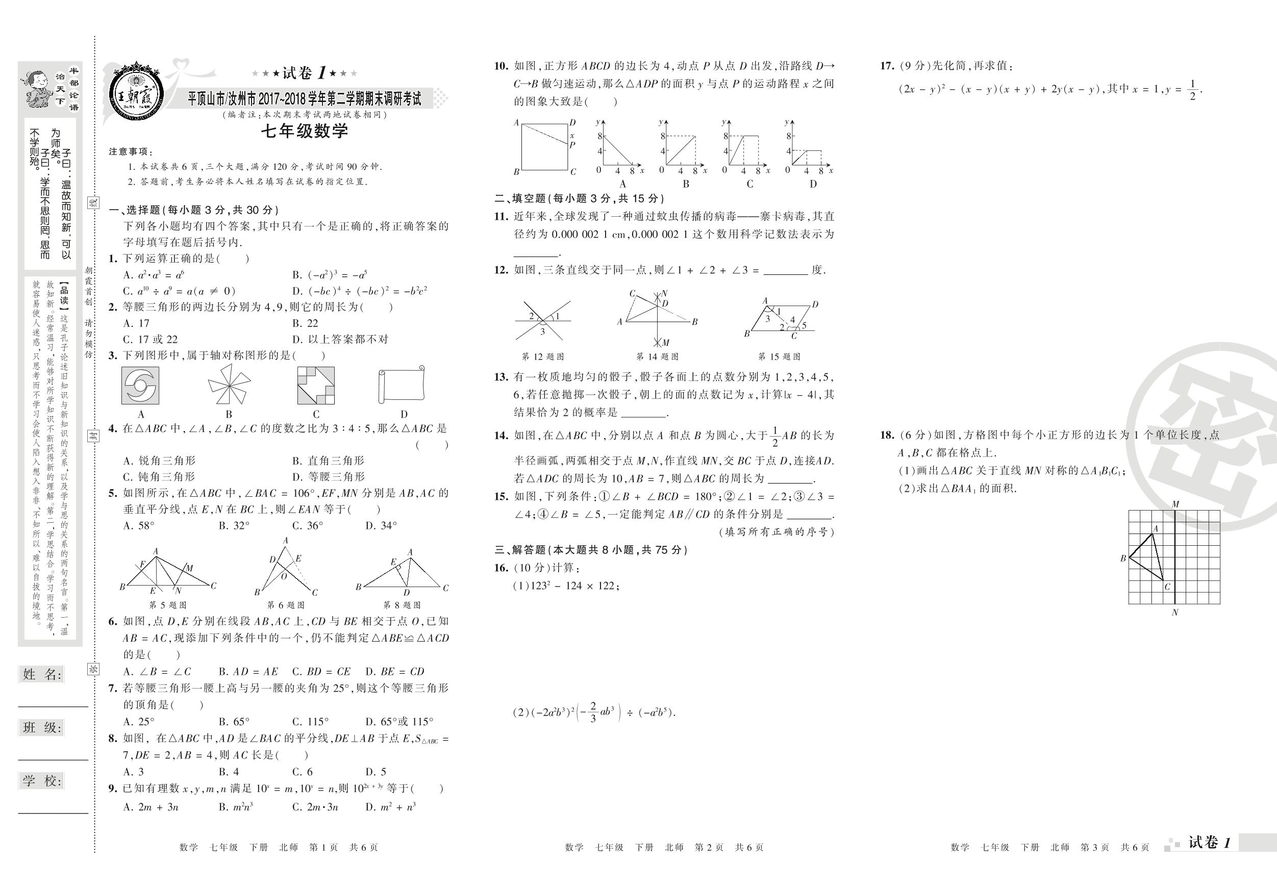2017-2018学年第二学期平顶山市、汝州市七年级数学试卷(北师版)【1】