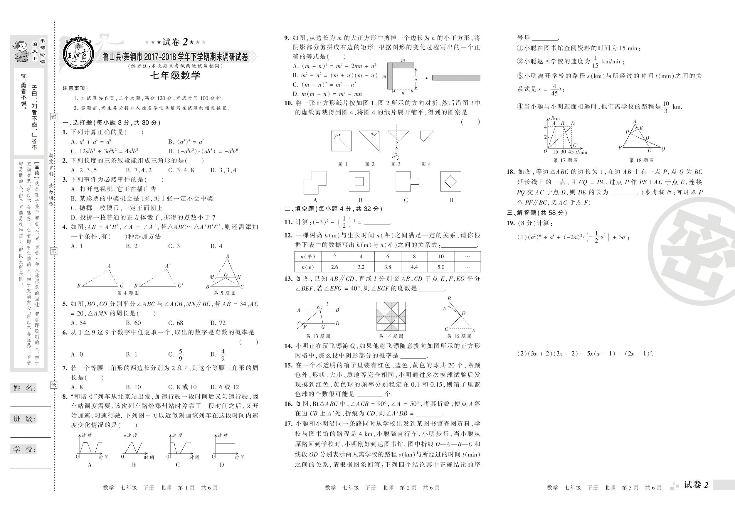 2017-2018学年第二学期鲁山县、舞钢市七年级数学试卷(北师版)【2】