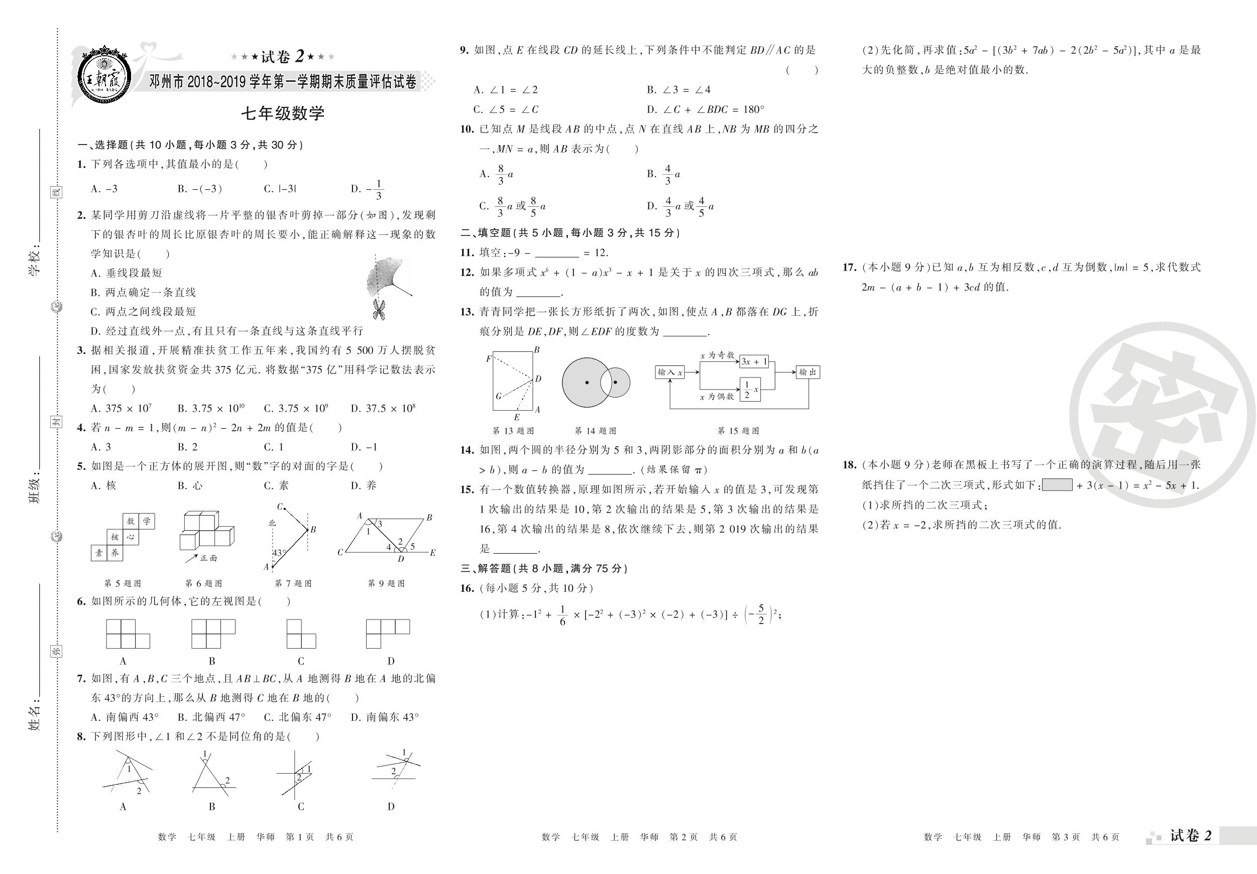 2018-2019学年第一学期邓州市七年级数学试卷(华师版)【2】