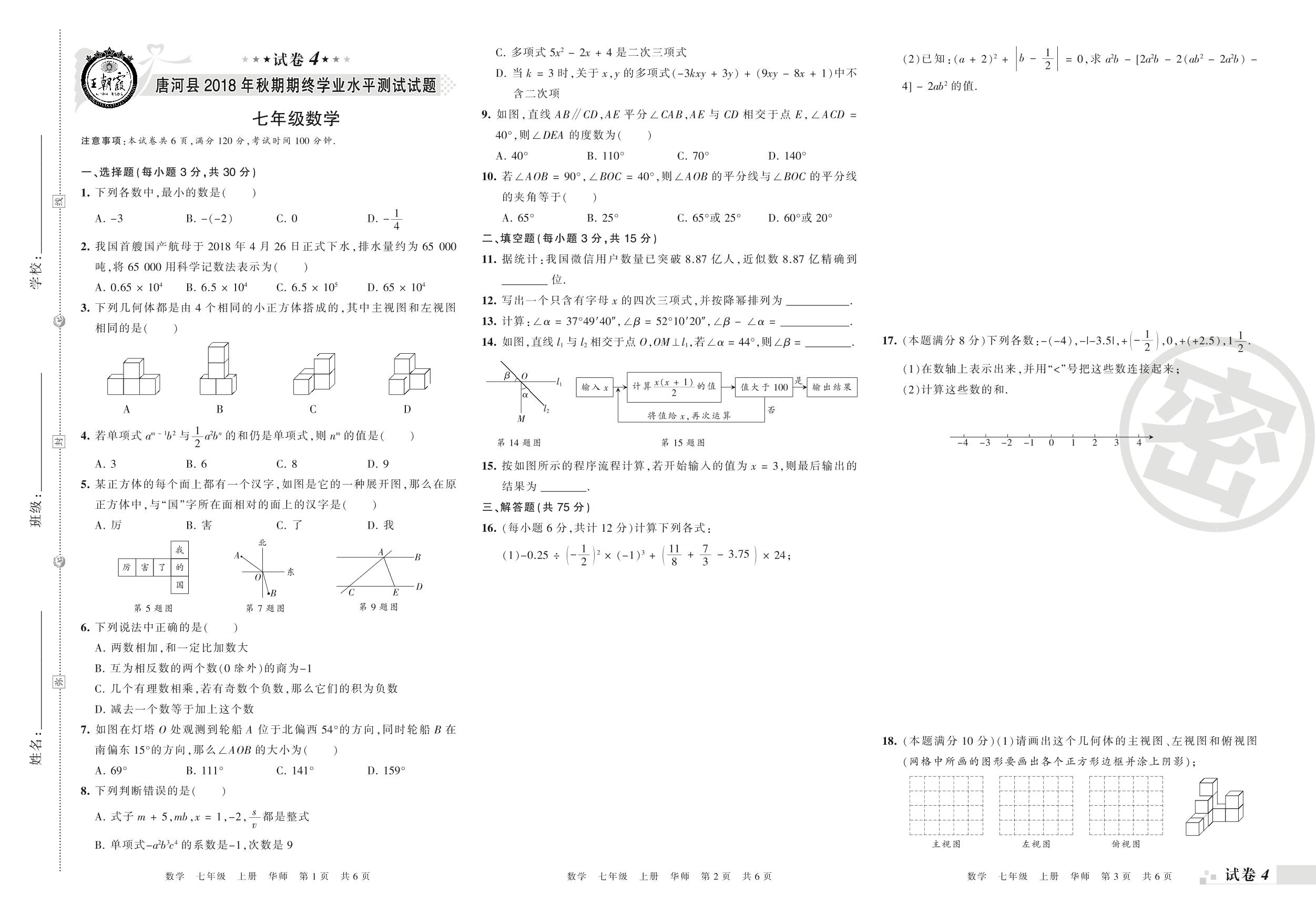 2018-2019学年第一学期南阳市唐河县七年级数学试卷(华师版)【4】