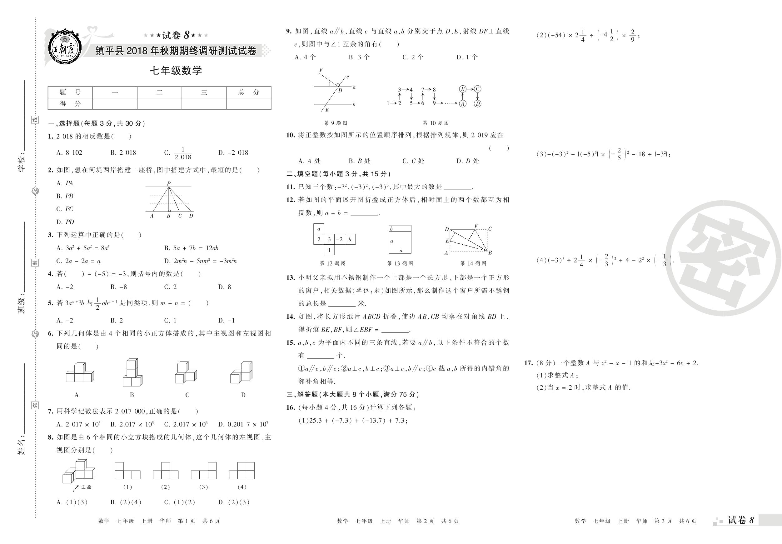 2018-2019学年第一学期南阳市镇平县七年级数学试卷(华师版)【8】