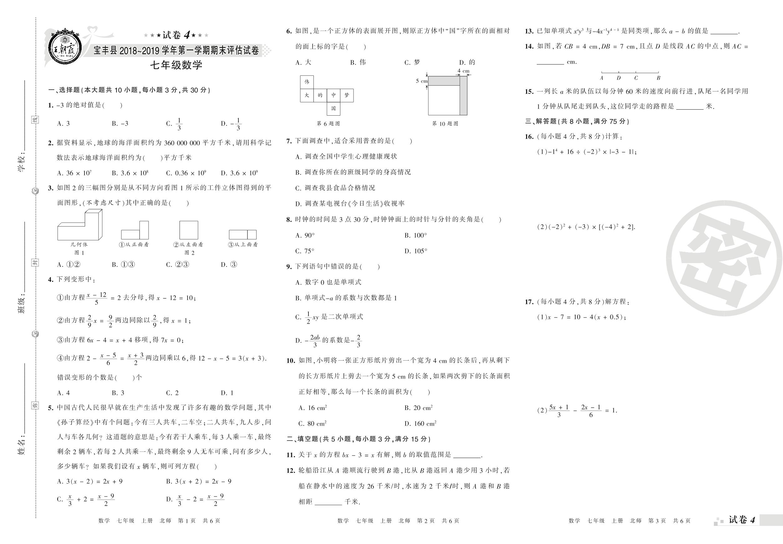 2018-2019学年第一学期平顶山市宝丰县七年级数学试卷(北师版)【4】