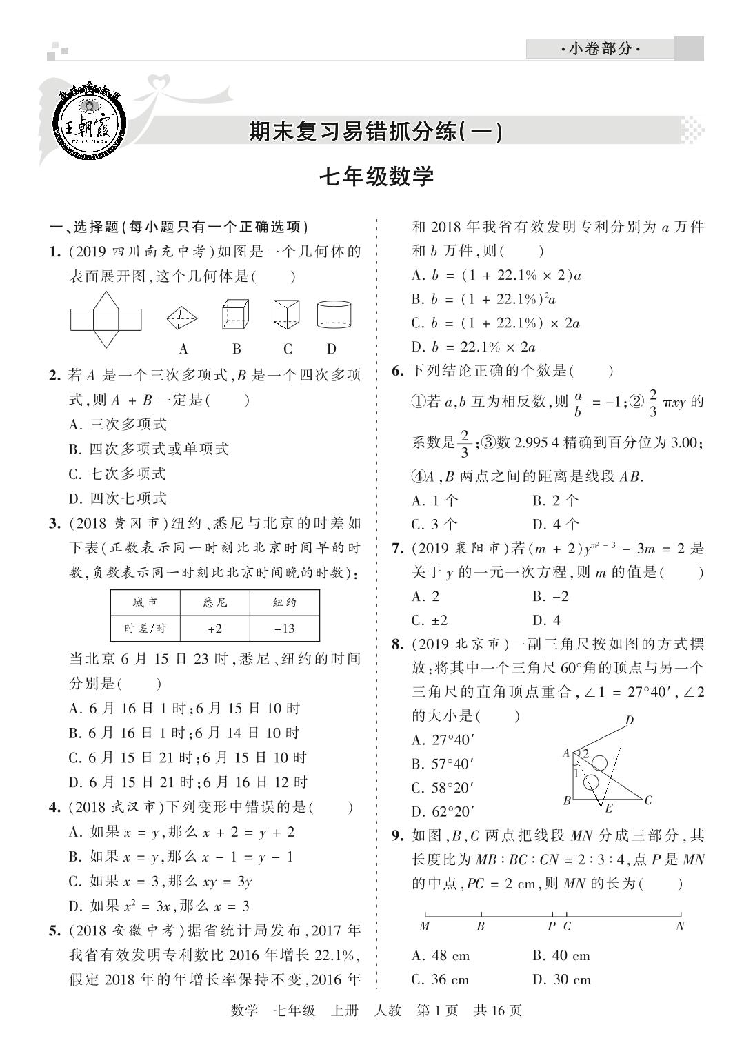 王朝霞期末小卷——期末复习易错抓分练七年级上册数学(人教版)_R210805160730【0】