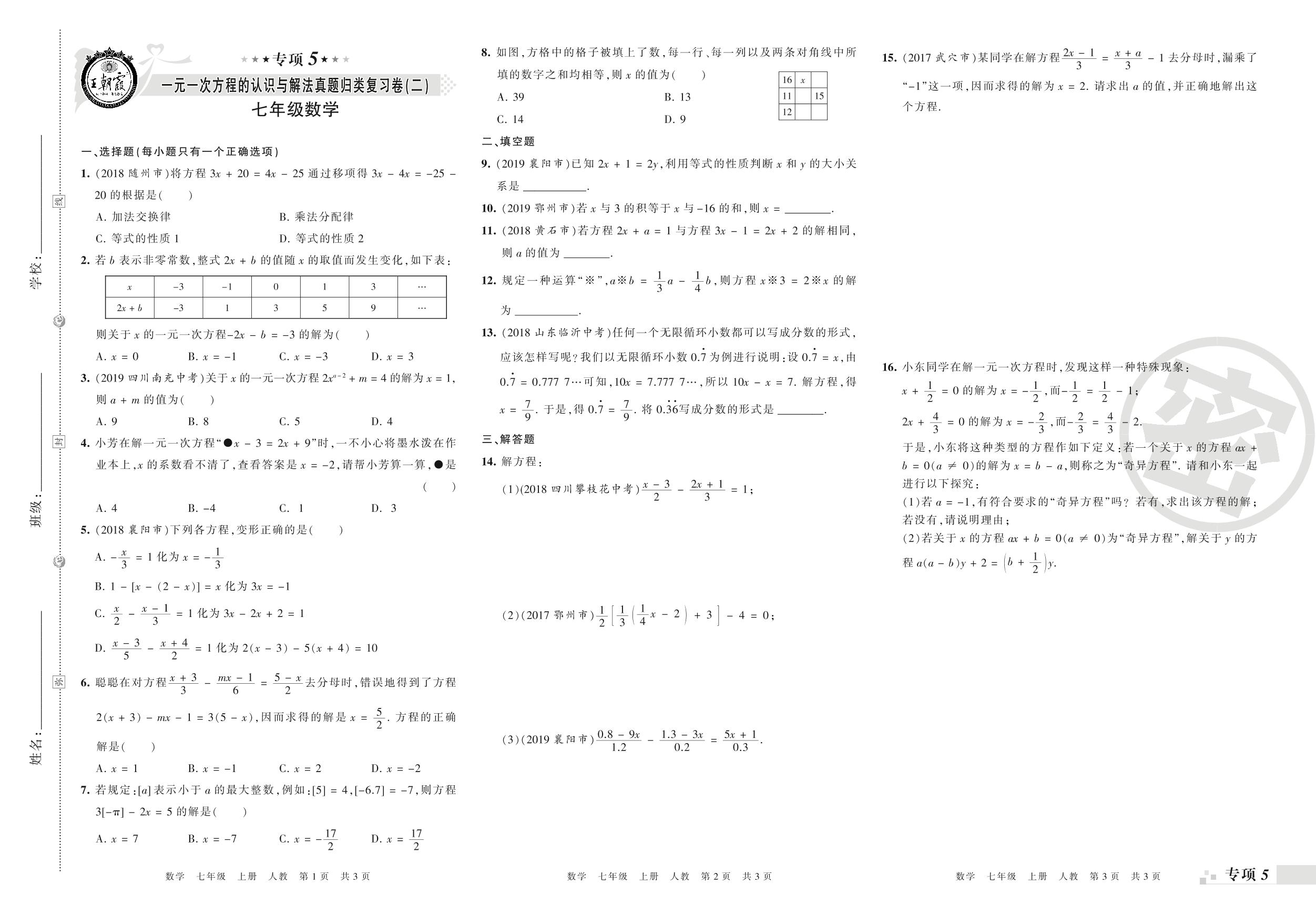 王朝霞期末专项卷——一元一次方程的认识与解法、一元一次方程的应用真题归类复习七年级上册数学(人教版)_R210805160744【0】