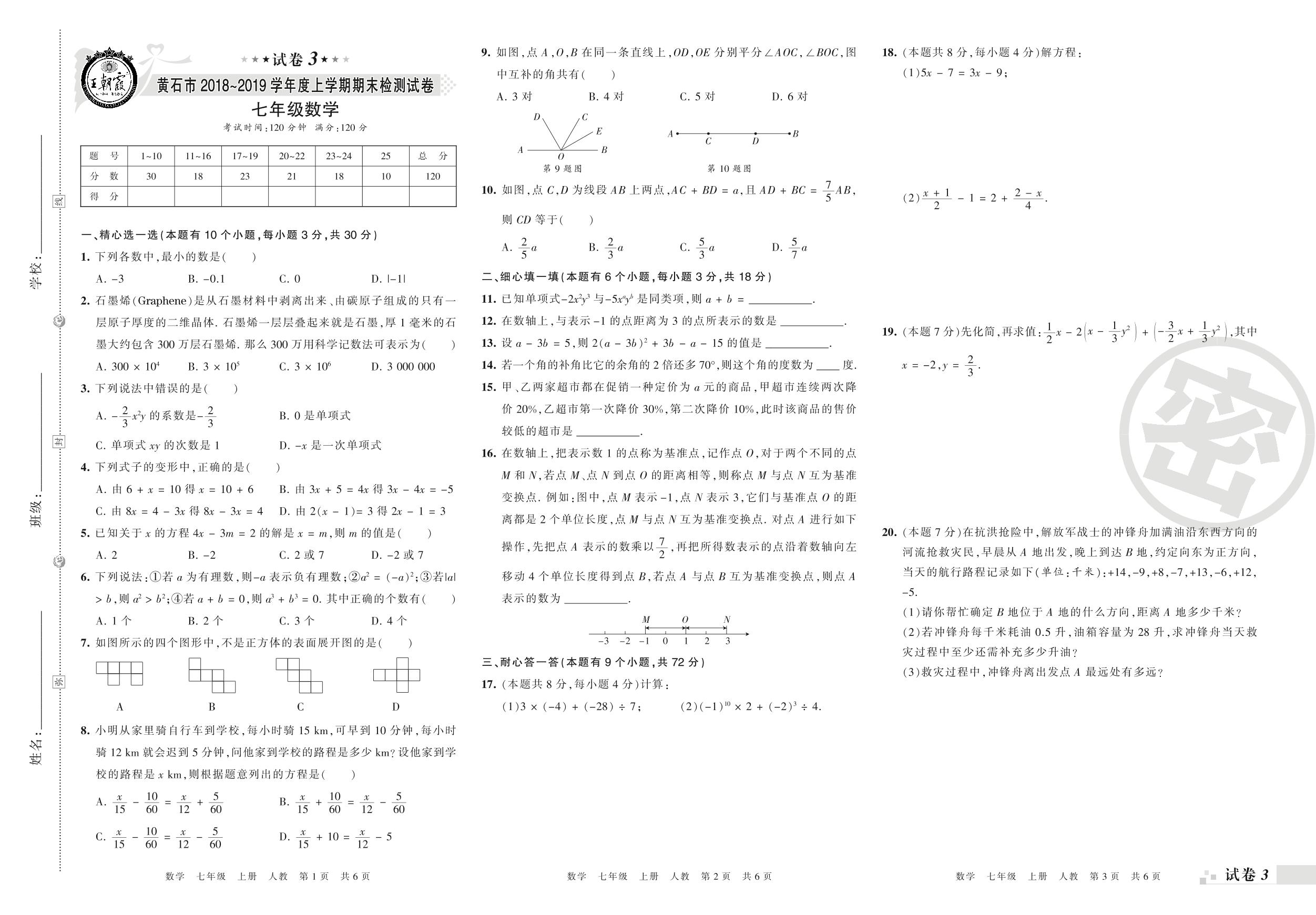 2018-2019学年第一学期黄石市七年级数学试卷(人教版)【3】