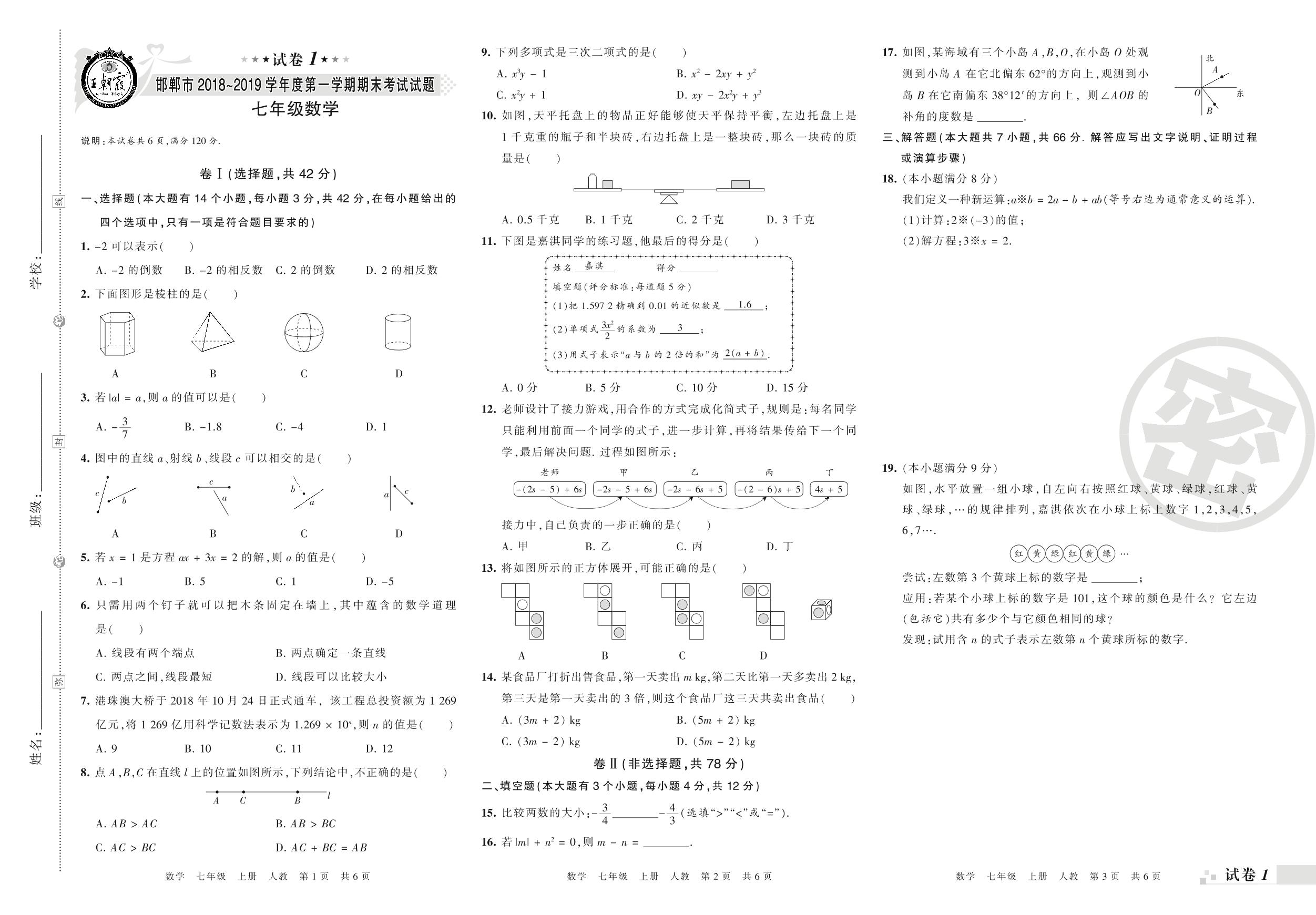 2018-2019学年第一学期邯郸市七年级数学试卷(人教版)【1】
