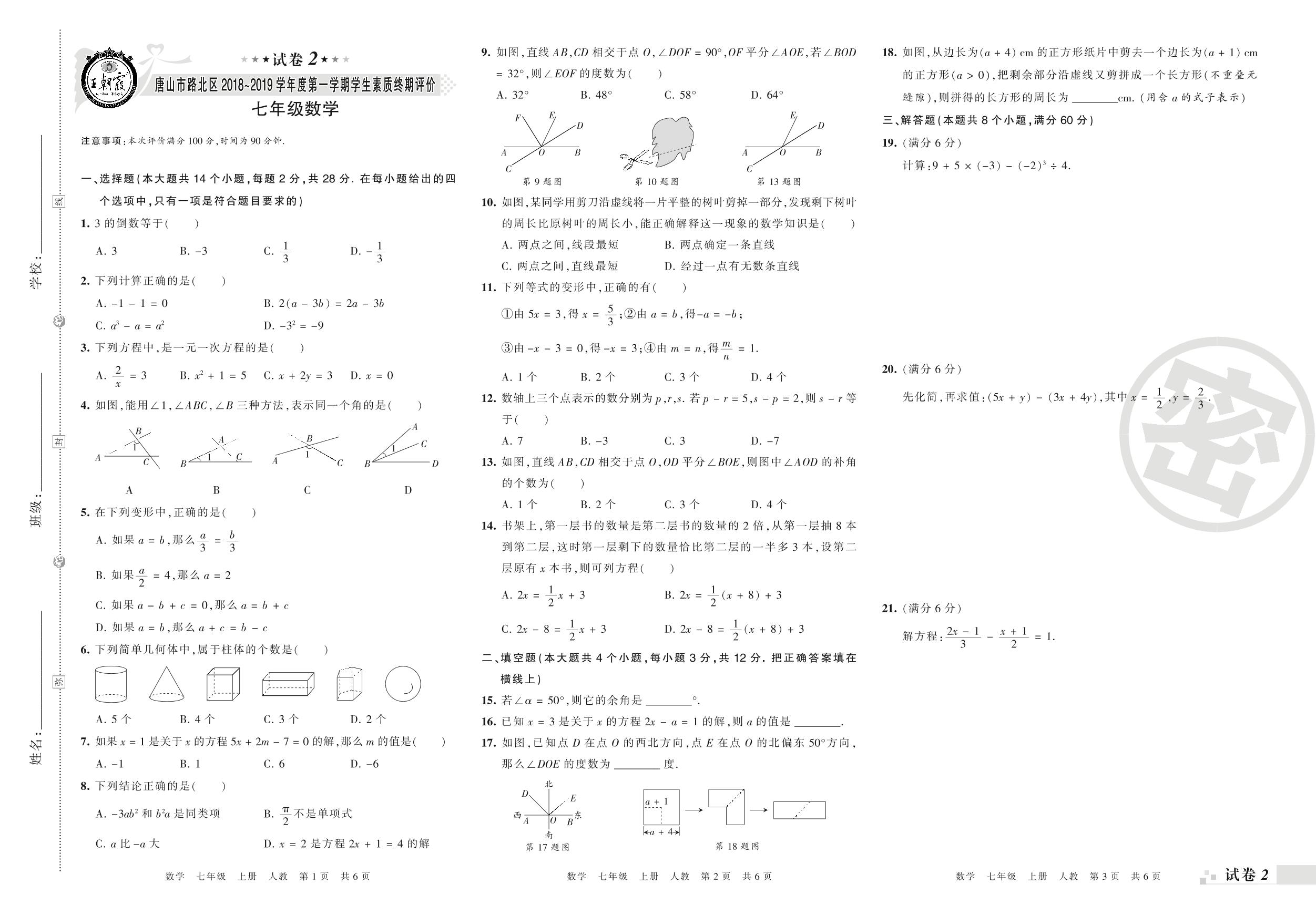 2018-2019学年第一学期唐山市路北区七年级数学试卷(人教版)【2】