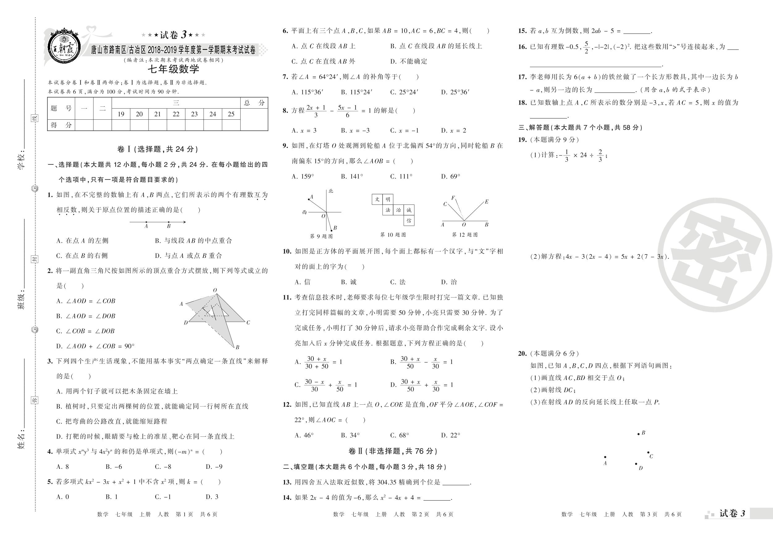 2018-2019学年第一学期唐山市路南区、古冶区七年级数学试卷(人教版)【3】