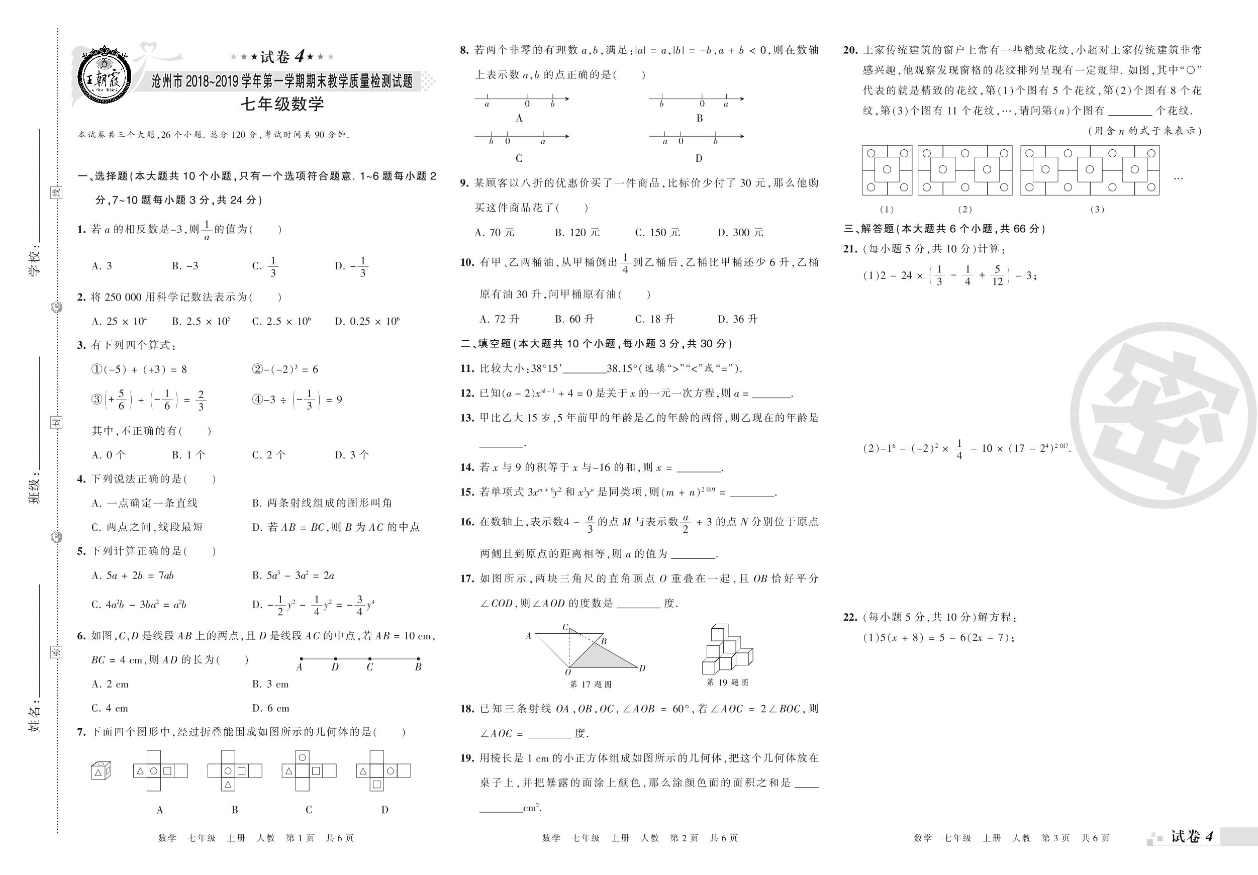 2018-2019学年第一学期沧州市七年级数学试卷(人教版)【4】