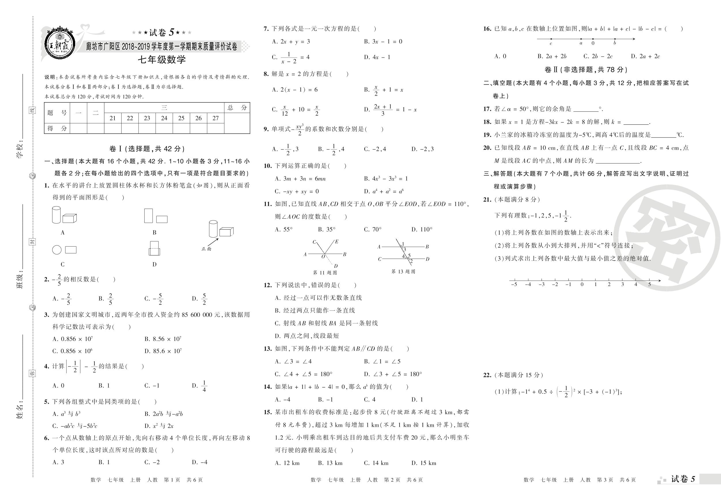 2018-2019学年第一学期廊坊市广阳区七年级数学试卷(人教版)【5】