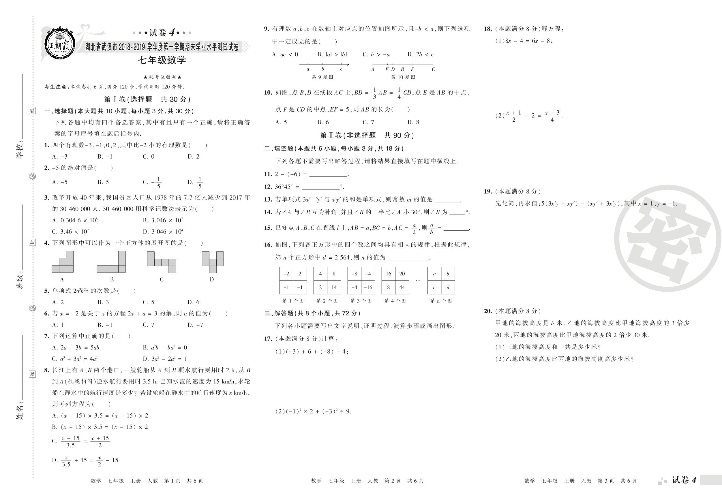 2018-2019学年第一学期湖北省武汉市七年级数学试卷(人教版)【4】