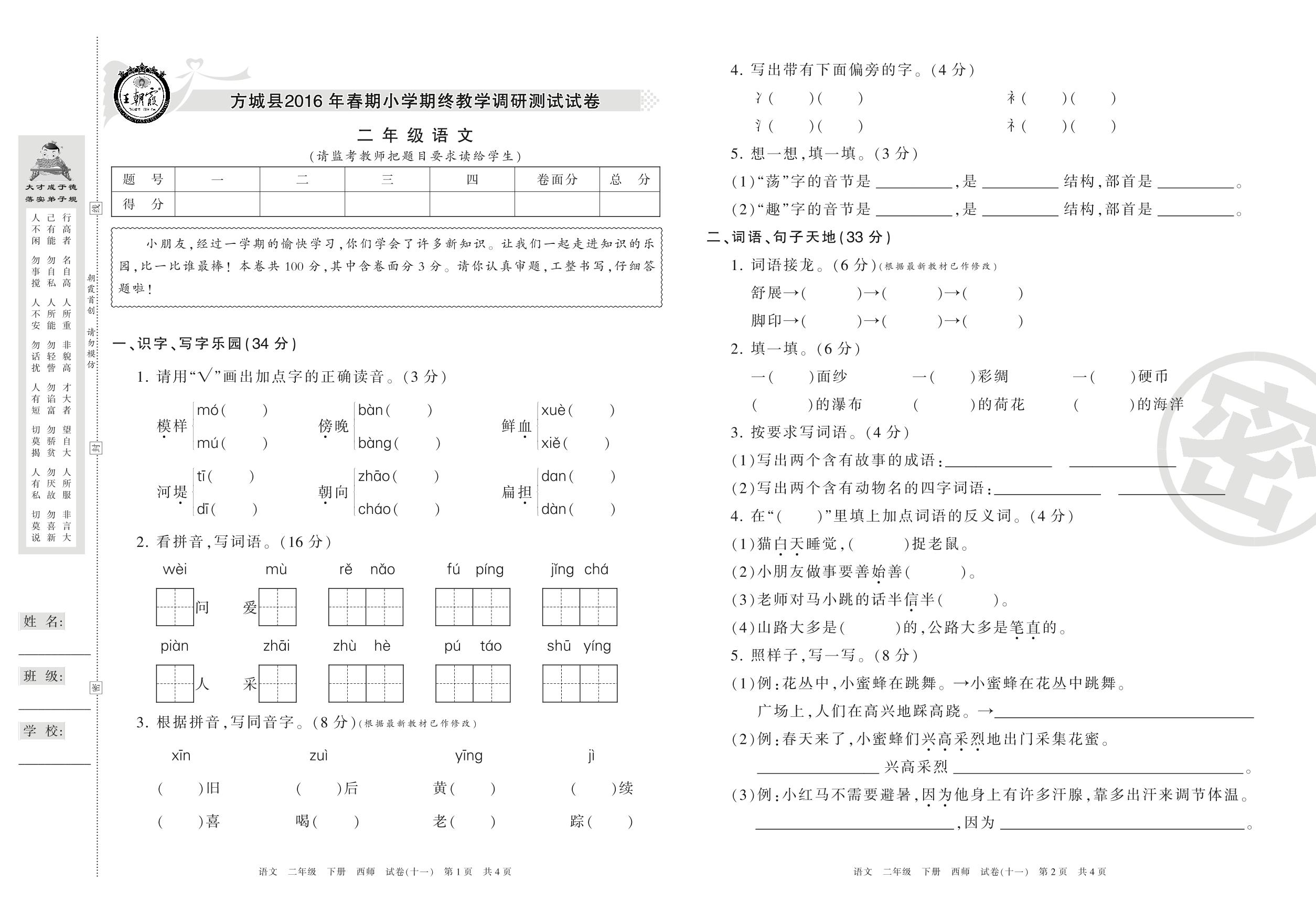 2015-2016学年第二学期南阳市方城县二年级语文试卷(西师版)【11】