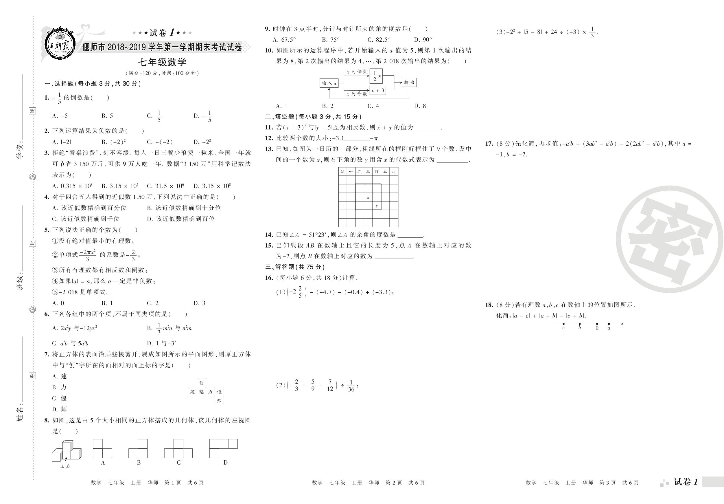 2018-2019学年第一学期偃师市七年级数学试卷(华师版)【1】