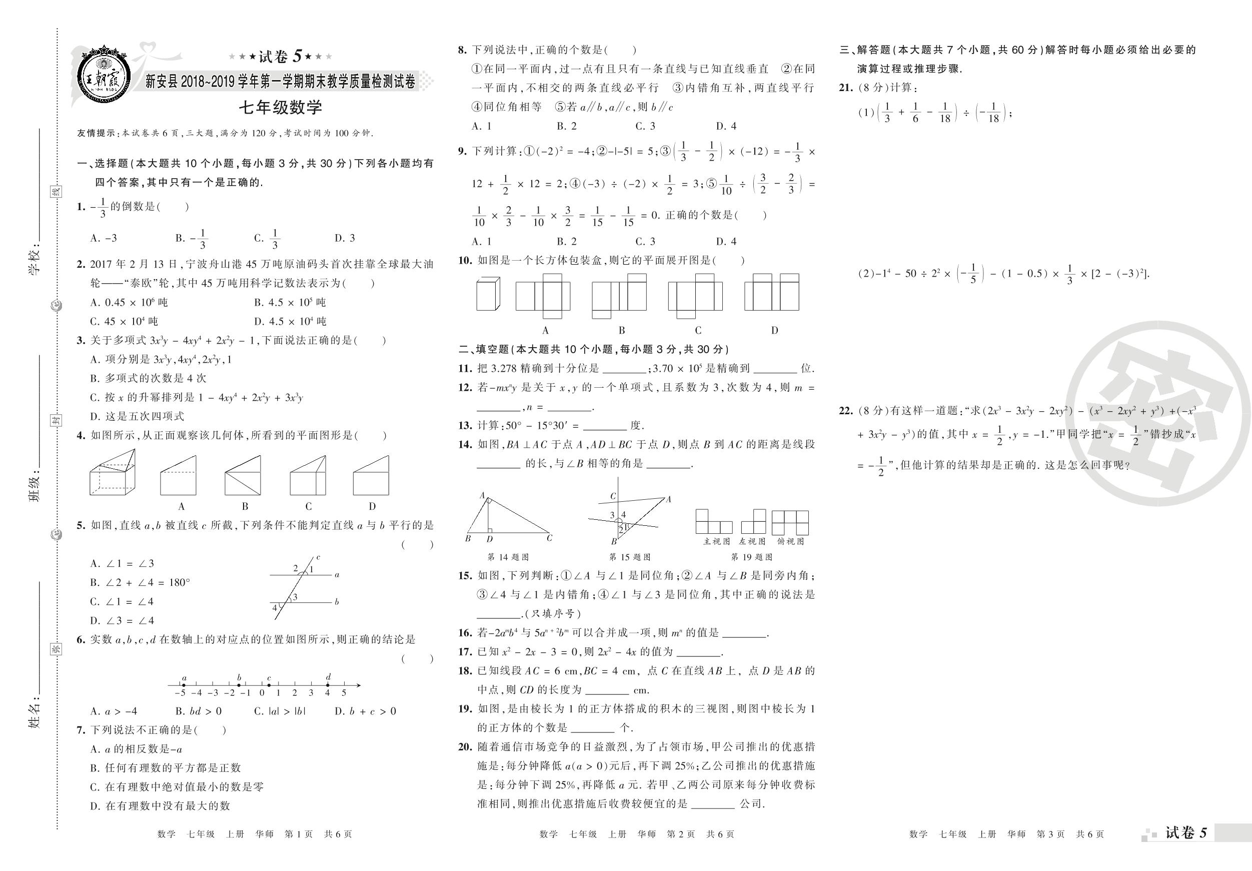 七年级数学华师版上册期末卷