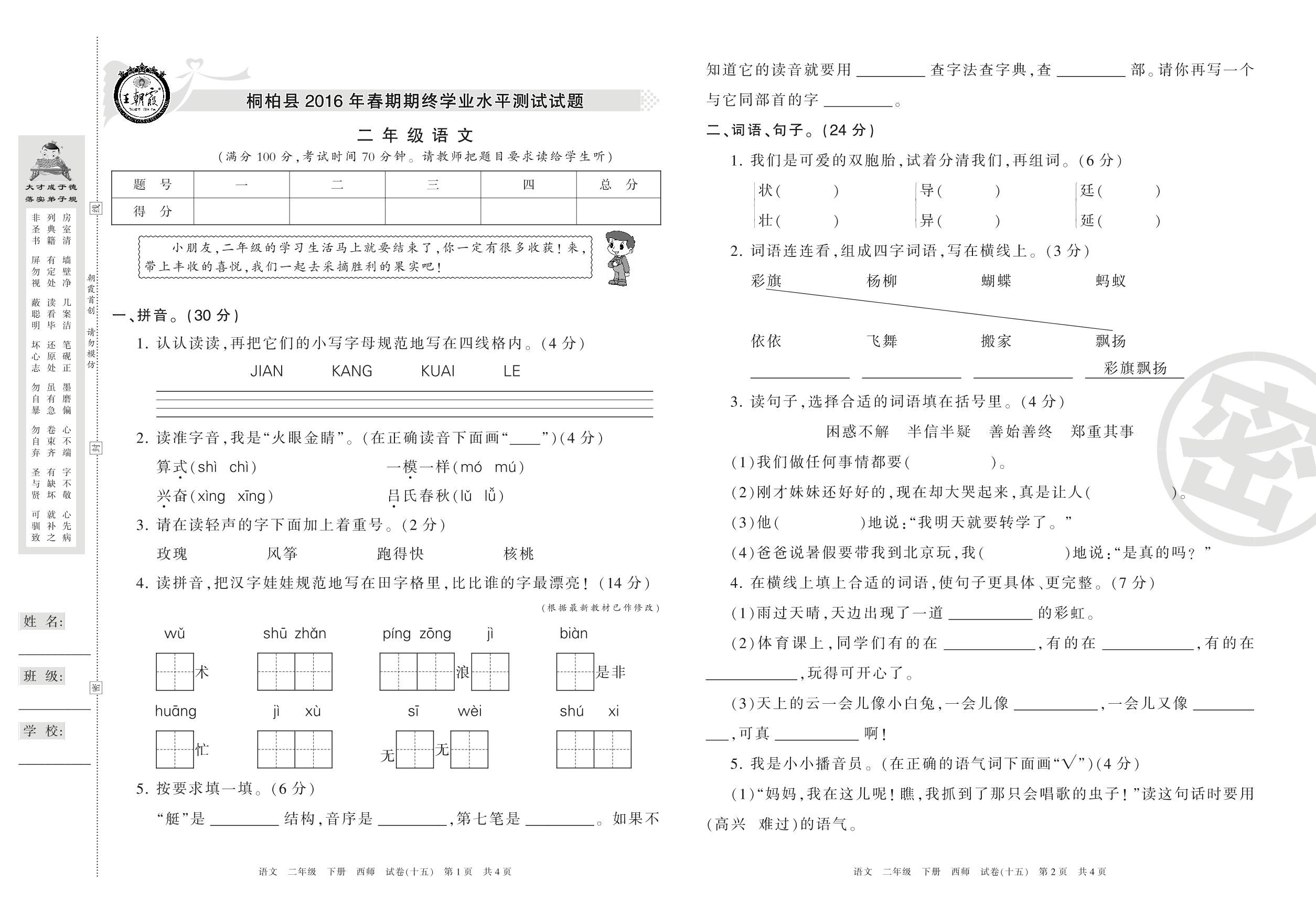 2015-2016学年第二学期南阳市桐柏县二年级语文试卷(西师版)【15】