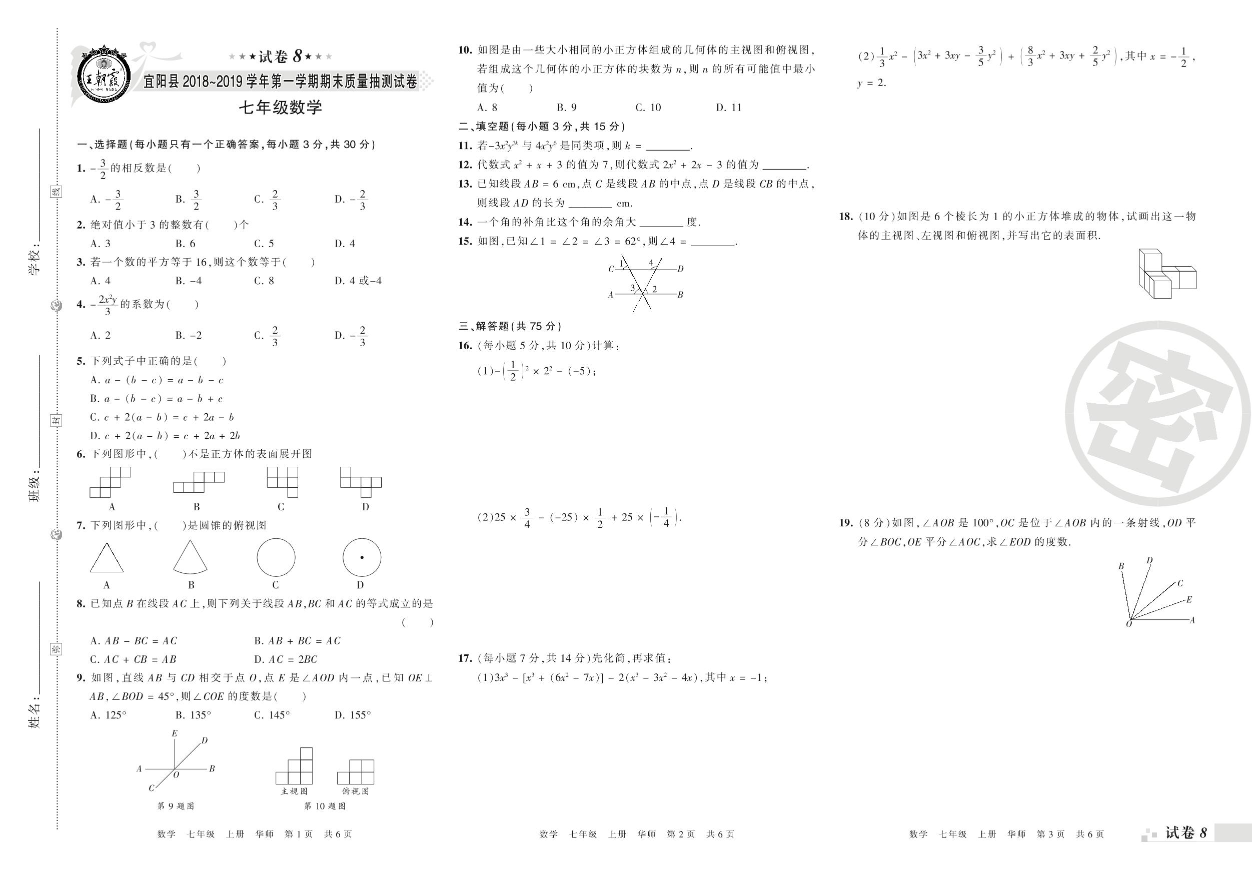 2018-2019学年第一学期洛阳市宜阳县七年级数学试卷(华师版)【8】