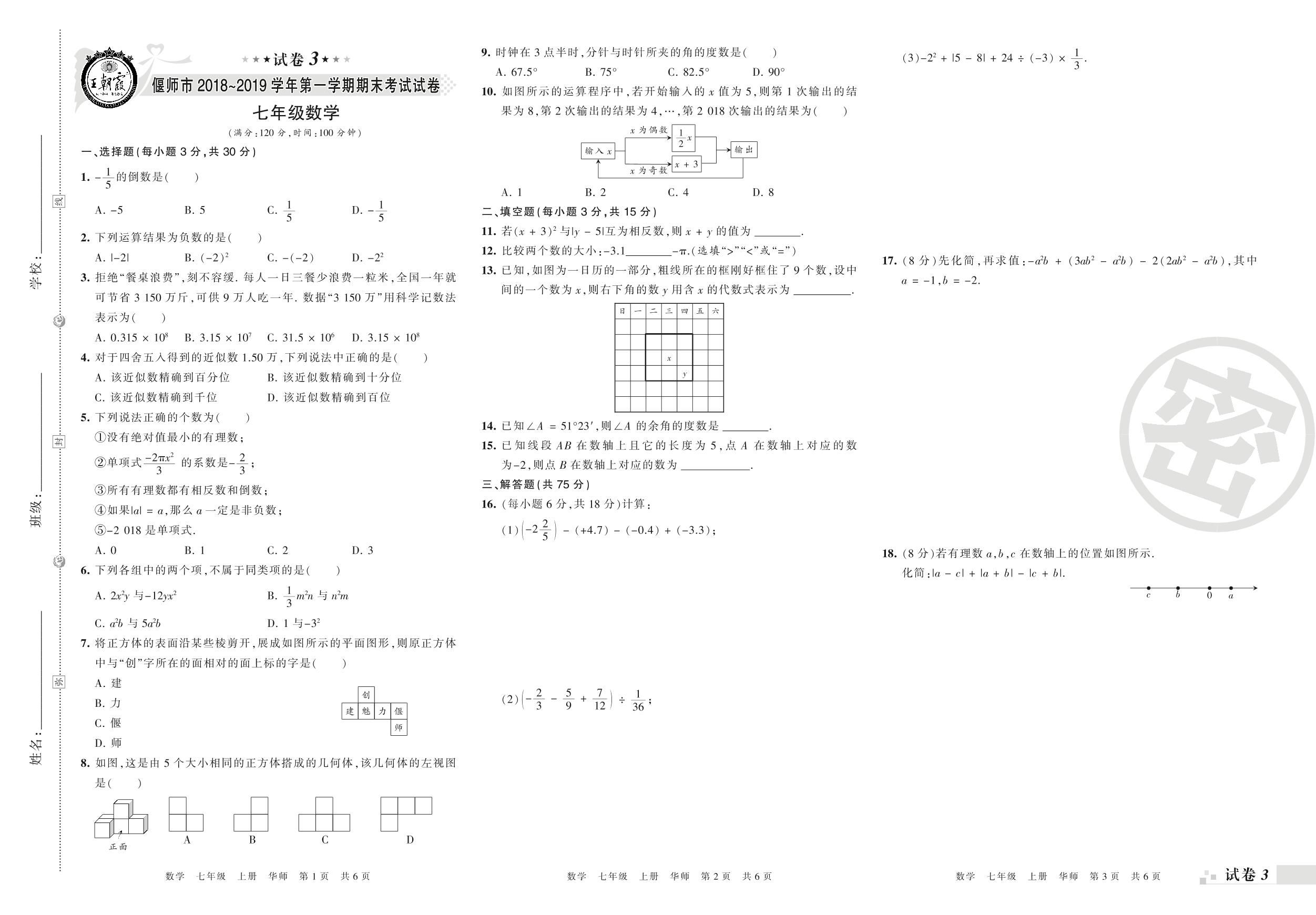 2018-2019学年第一学期偃师市七年级数学试卷(华师版)【3】