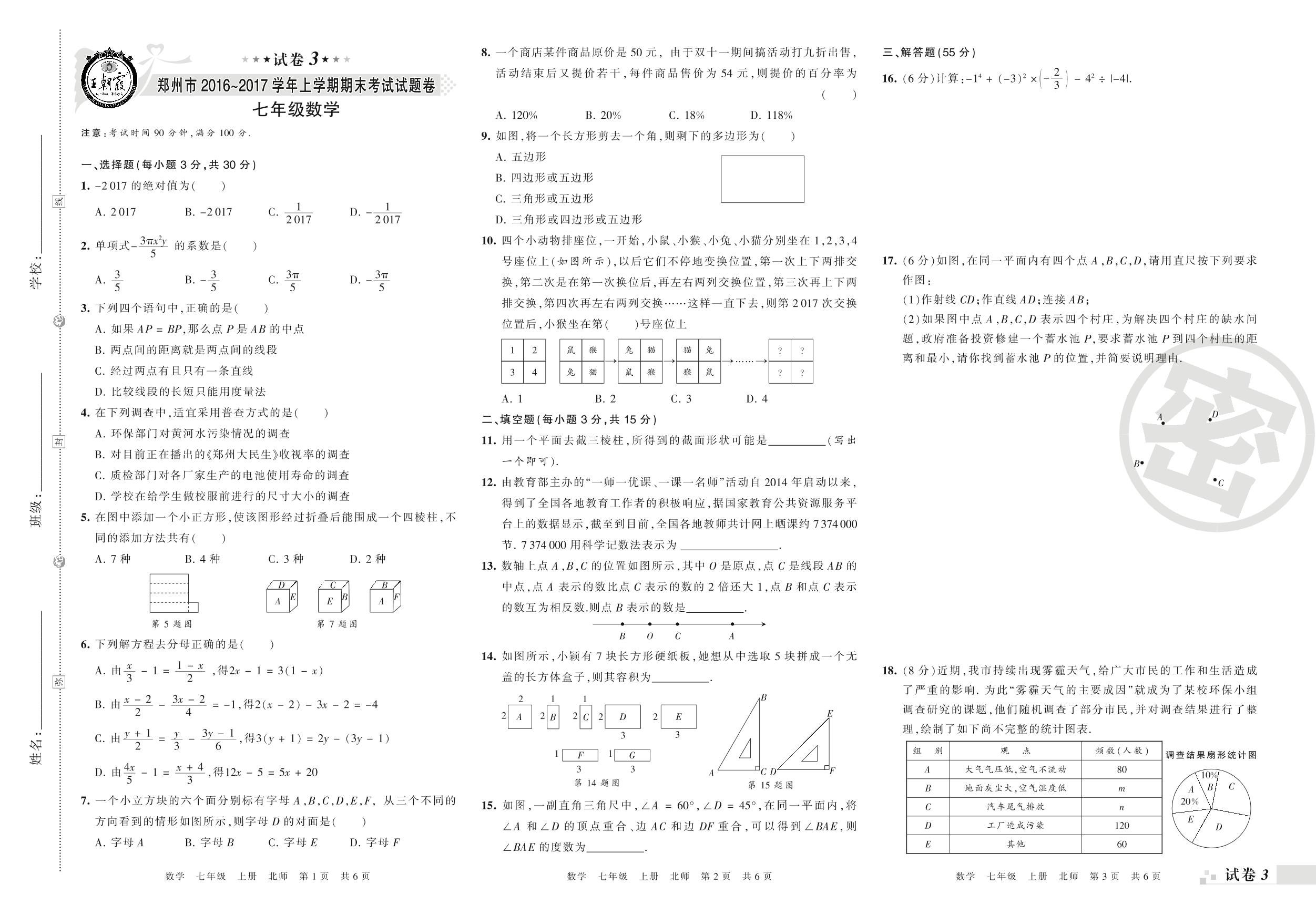 2016-2017学年第一学期郑州市七年级数学试卷(北师版)【3】