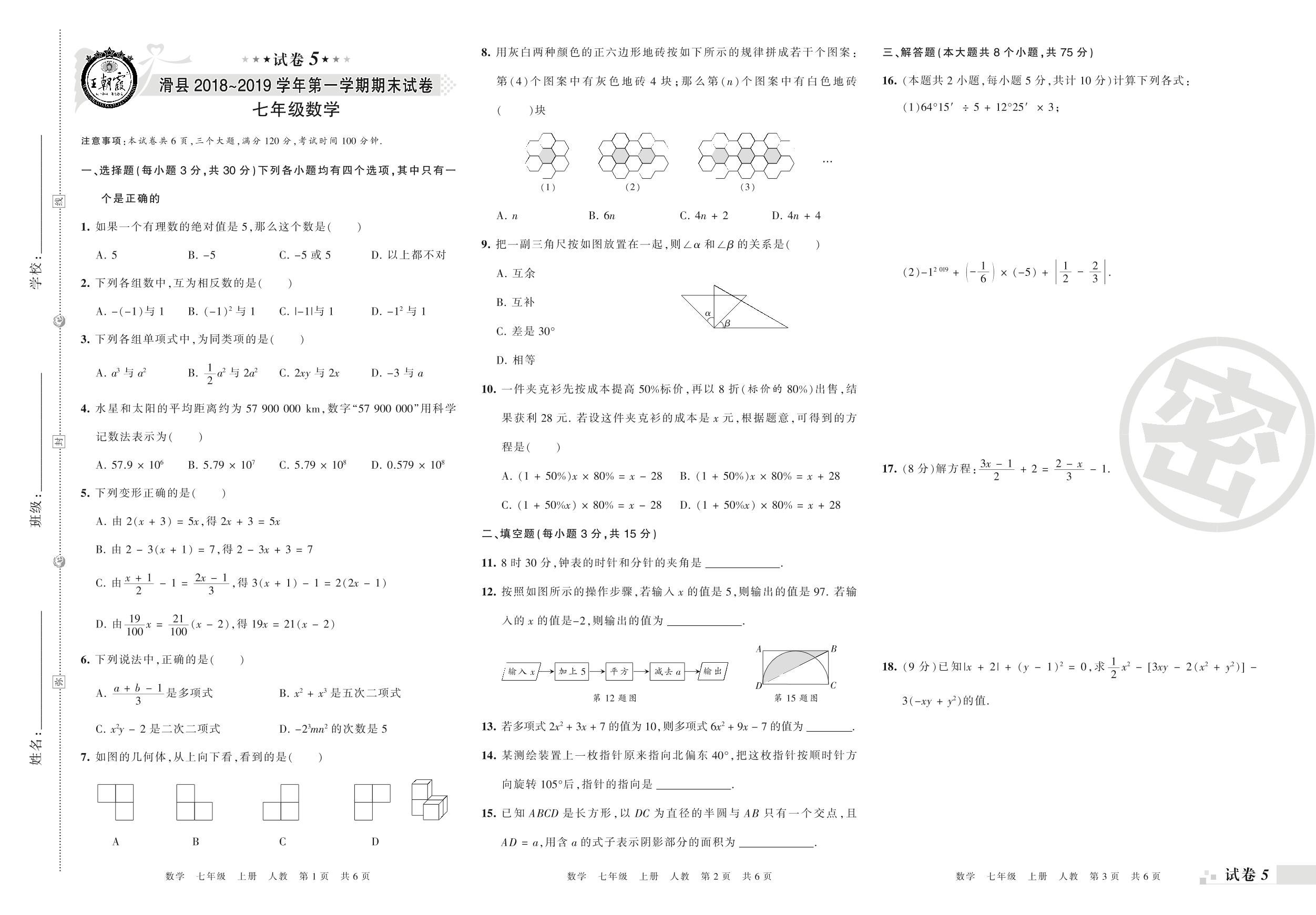 2018-2019学年第一学期安阳市滑县七年级数学试卷(人教版)【5】