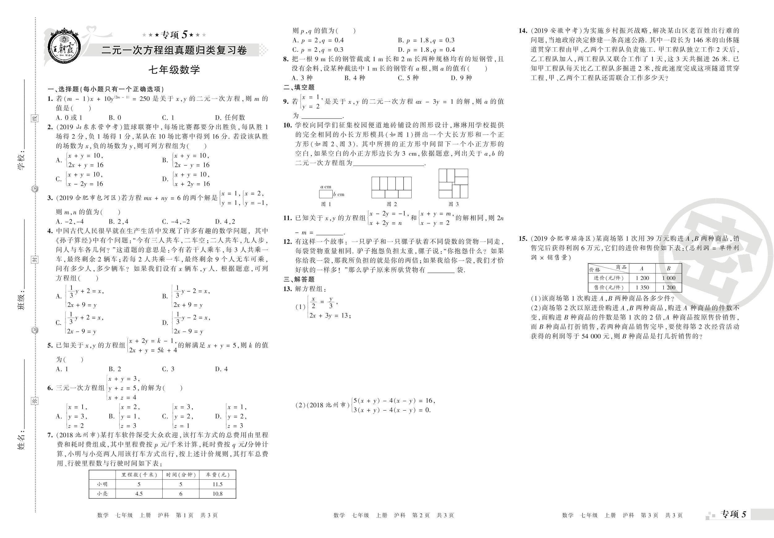 王朝霞期末专项卷——二元一次方程组、几何图形与直线、射线线段真题归类复习七年级上册数学(沪科版)_R210805161829【0】