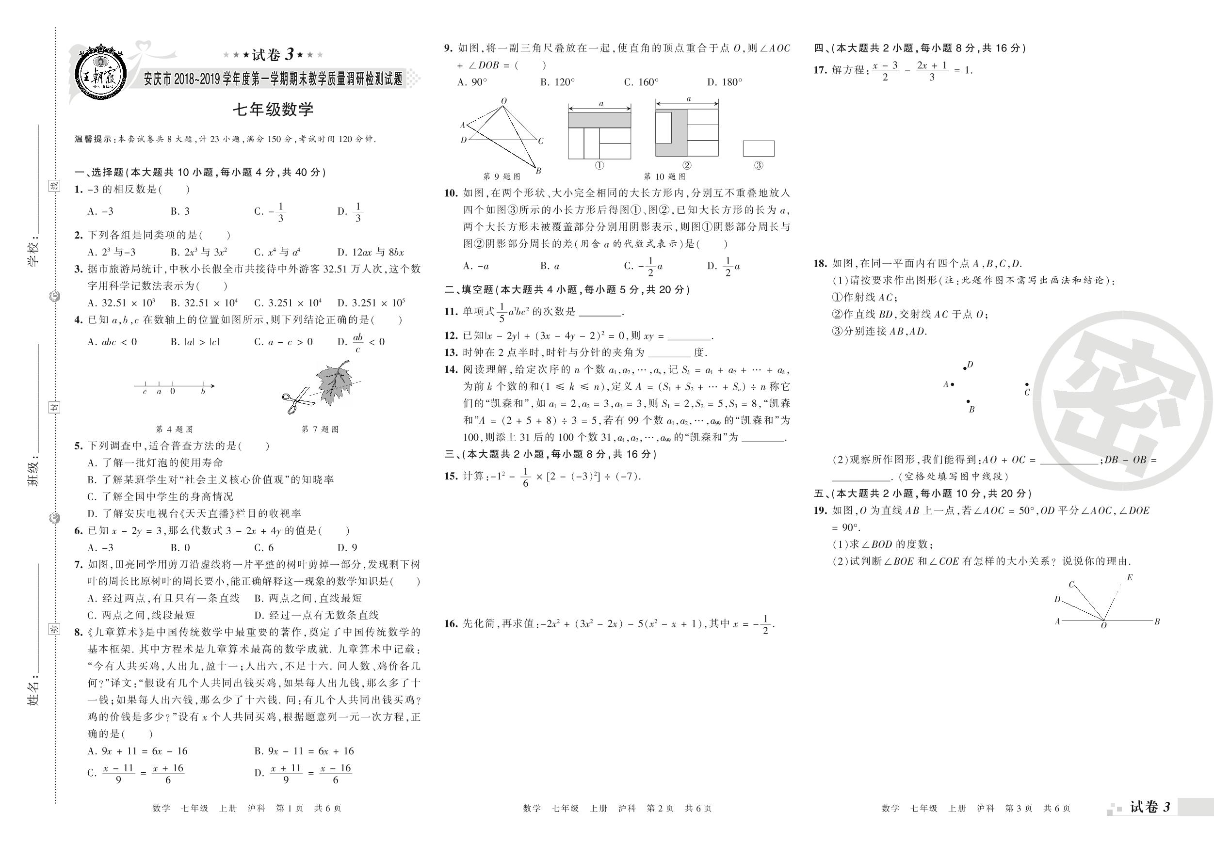 2018-2019学年第一学期安庆市七年级数学试卷(沪科版)【3】